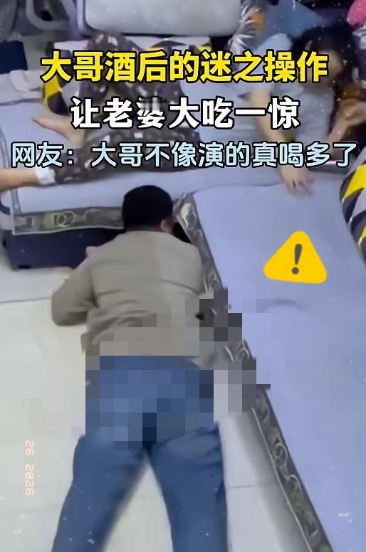 比春晚都好笑!吉林,一男子外出聚会喝酒,回到家时,已经醉的不行,妻子看到后还说:这是喝多少?谁知男子摆了摆手,脱下衣服后来了一个迷之操作,把老婆吓得从沙发上跳起来。 这段无剧本无演绎的真实视频直接火出圈,千万网友笑到停不下来。平时老实本分的男人,几杯酒下肚彻底放飞,把外套袖筒当裤子穿,还把妻子当成陌生人推开,说怕媳妇知道,甚至趴在地上玩起了陆地游泳,又傻又可爱。 笑归笑,真的要提醒大家,小酌怡情,大酒伤身又失态。酒精能让人放下压力,也能让人做出荒唐事,最心疼的还是在家等你的那个人。 喝酒可以,但千万别喝到断片失态,你身边有没有这样喝酒后秒变“戏精”的朋友?