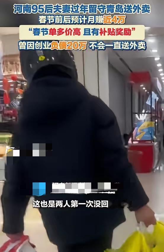 夫妻同心,其利断金!山东青岛这对95后夫妻,春节留守跑外卖,一个月狂赚近4万,看哭无数打工人! 这对河南小夫妻创业失败,背上20万债务,为了早点上岸,狠心把孩子送回老家,春节放弃团圆,一头扎进跑单里。 别人过年吃喝玩乐,他们从早跑到晚,一个月合计跑了近3000单,再加上春节留岗补贴、节日奖励,收入直接冲到近4万。 每天累到筋疲力尽,可他们一点不抱怨,说债会一笔笔还清,人在一起,就没有跨不过去的坎。 这哪里是送外卖,分明是在为生活拼命。最好的日子,不是大富大贵,而是夫妻同心,一起扛过最难的时光。 靠自己双手踏实赚钱,再苦都值得,这样努力的人,日子一定会越来越好。 你愿意为了多赚钱,春节不回家坚守岗位吗?