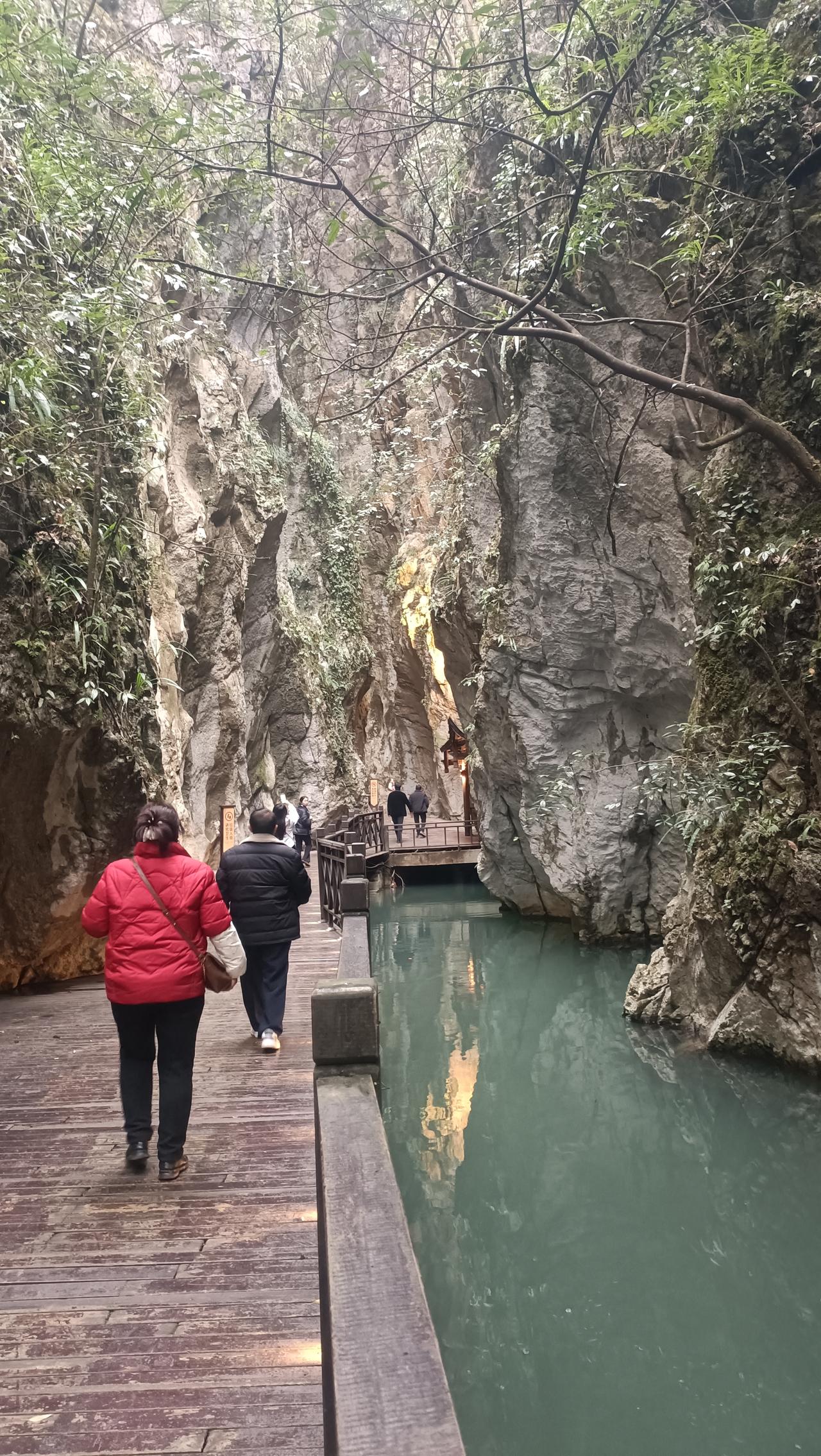 今天来到张家界地缝,在慈利县的大山里面。反正坐车绕来绕去,全是山路,走了半天才到。 所谓地缝,就是两山之间的峡谷,由于特别狭窄,就像裂了一道缝一样。这地形造就的景观也就别有特色。 张家界地缝原来叫朝阳地缝,一路都有一条河水流淌,河水碧绿,很是清澈好看。 洞内冬暖夏凉,走在其中,体感非常舒服。要是夏天来,边走边玩水,还是非常有意思的。