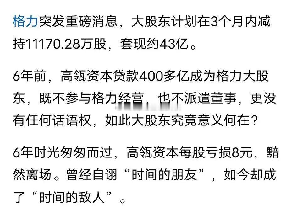 格力电器只有空调业务拿得出手,赚钱能力太单一了,一个企业最大的风险就是产品太单一了,一旦空调业务被蚕食就日落西山了。这次减持以大宗交易为主,就看交易对象是谁了,如果对手接盘,那阿姨这一届做完就该退休了。高瓴资本退出的话,董事会就得重组,阿姨很难左右公司了,因为大股东换人了。一个企业的领导人,要是整天在网络上和别人抬杠,绝不是好事。