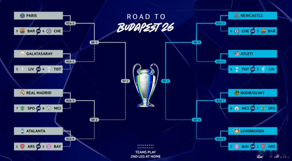 欧冠 25-26赛季欧冠16强全部产生,如附图。周五将进行抽签仪式,可能的对阵见附图2。我期待着曼城能遇上那支种族歧视风波中的球队,将其淘汰出局,八强最好没他。