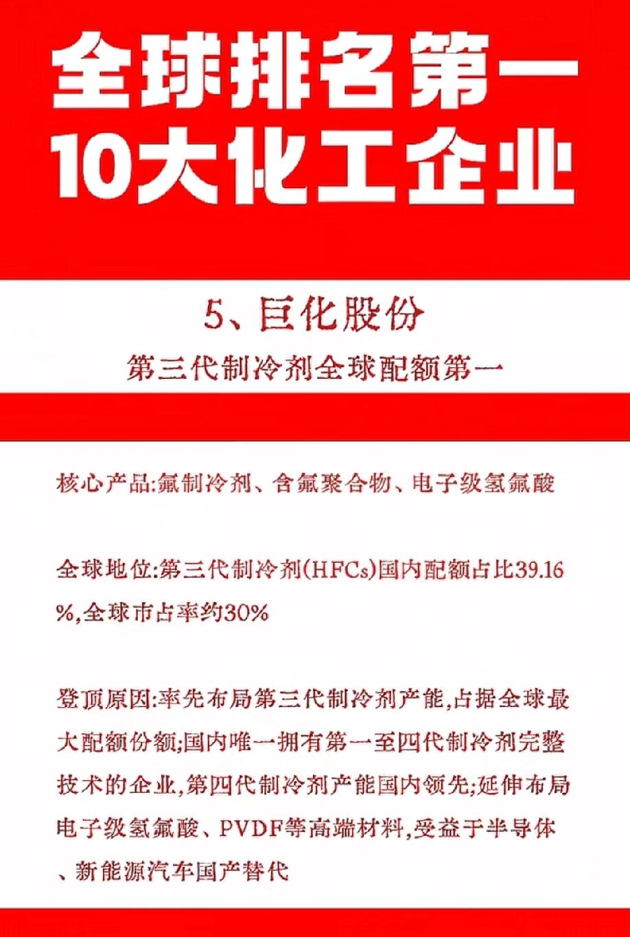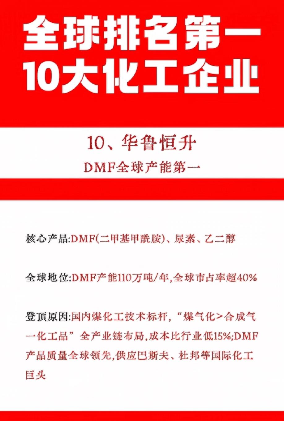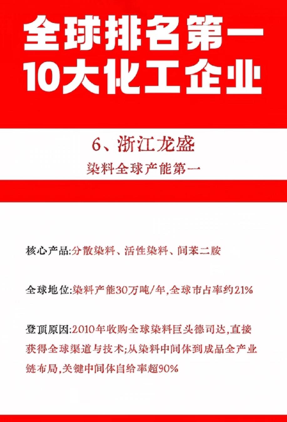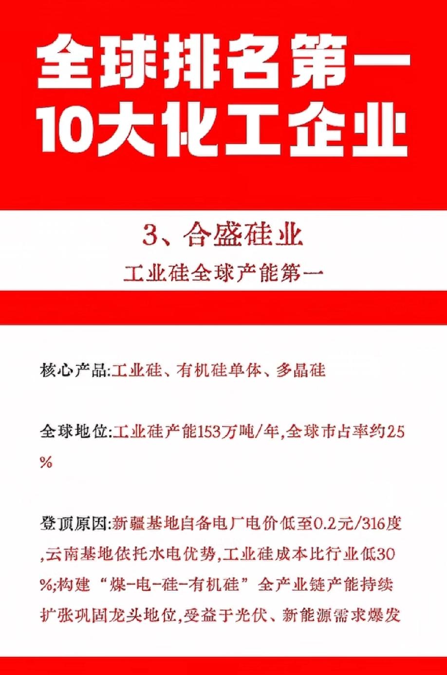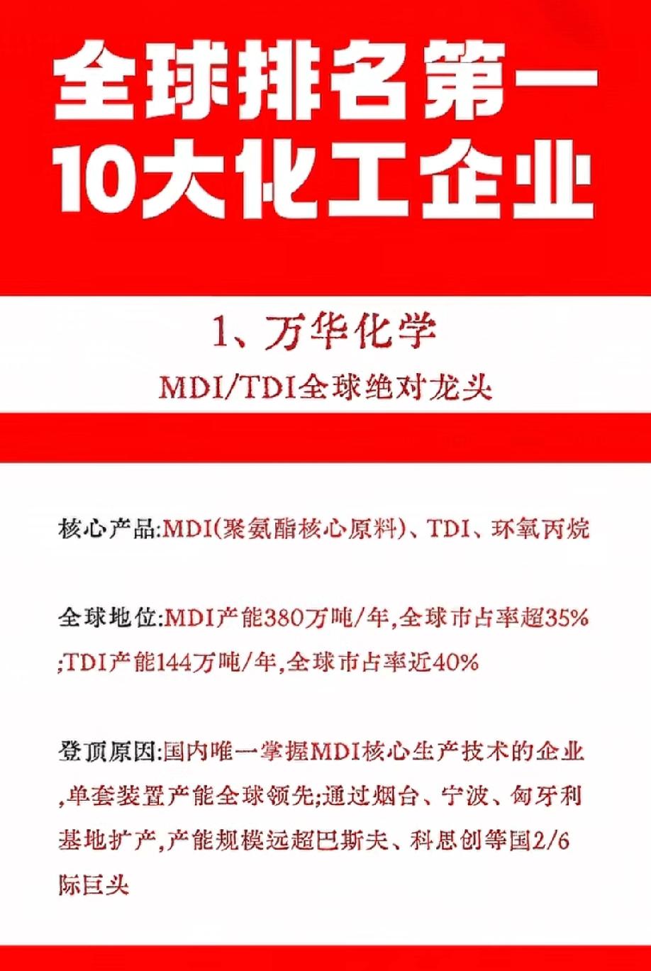 硬核碾压!中国10大化工巨头霸榜全球,每一家都是细分赛道绝对王者,快来看看有没有您的持仓? 中国化工,霸榜全球!这10家企业凭实力登顶细分赛道第一,从MDI、钛白粉到电解液、维生素,每一家都是行业里的绝对龙头,用技术和产能改写全球化工格局,彰显中国制造的硬核底气! 在这十大王者中最强的三家公司有谁?如果从技术壁垒、全球市占率、产业链话语权三个维度综合来看,我认为这三家是当之无愧的最强王者:万华化学、龙佰集团、合盛硅业! 这三家企业不仅在各自赛道做到了全球第一,更重要的是它们通过技术突破和全产业链布局,真正掌握了行业定价权和发展主动权。具体理由见配图! ⚠️ 以上信息仅供行业参考,不构成投资建议。