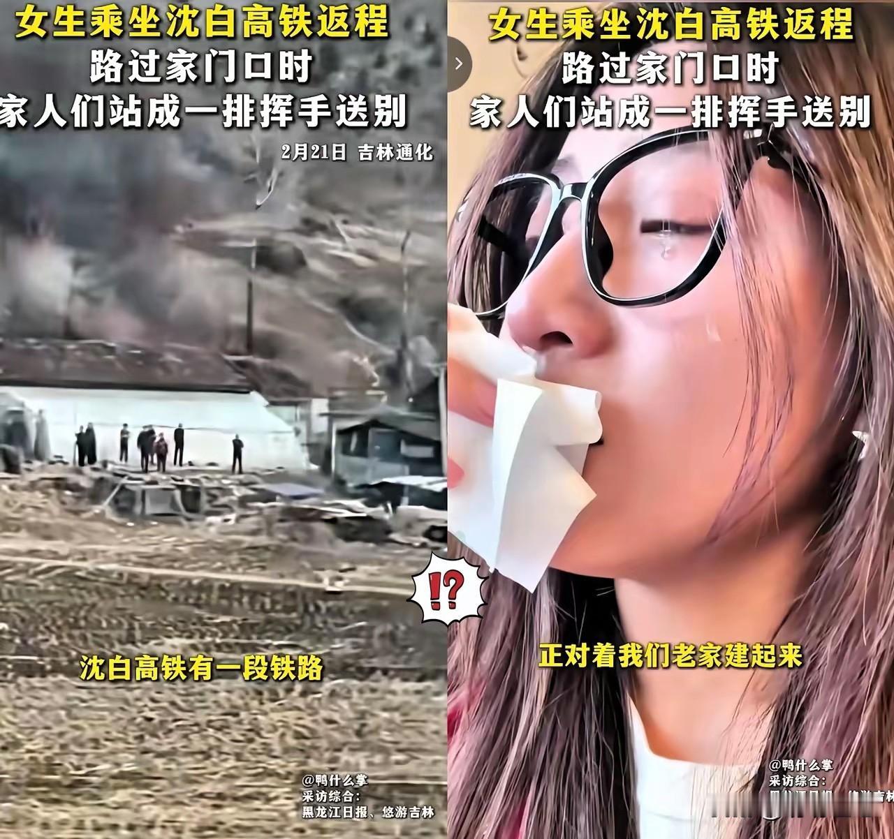 泪目!吉林通化,一名坐着高铁返程上班的女生,突然哭了。原因竟然是列车经过她家门口的时候,她看见爸妈、爷爷奶奶、弟弟妹妹都在田间地头上挥手!这画面太美了,她没控制住自己的泪。 这不是矫情,是每个在外打拼的人都懂的瞬间破防。一句随口提的车次,全家人记在心上,顶着寒风站在田埂上等,只为几秒的挥手告别。 中国青年报调查显示,超七成异乡青年半年以上才能见一次父母。团圆成了奢侈品,告别成了常态,这是当代年轻人最真实的生存困境。 高铁再快,快不过父母的牵挂;路途再远,远不过心底的乡愁。我们奔赴前程,家人守着故土,用最笨拙的方式爱着我们。 有人说年轻人太脆弱,一点小事就流泪。可他们不懂,车窗内外是两个世界,一边是柴米油盐的安稳,一边是风雨兼程的打拼。 我们拼命赚钱,想给家人更好的生活,却常常忽略最珍贵的陪伴。数据显示,仅15%的青年愿意回乡团聚,现实总在理想与亲情间拉扯。 这挥手的身影,藏着中国式父母最沉默的深情。不打扰、不纠缠,只在你必经的路上,默默目送,把牵挂藏进每一次挥手里。 别让亲情只停留在春运的短暂相聚,别让告别成为常态。常联系、常回家,别让等待变成遗憾,别让牵挂变成心酸。 各位读者你们怎么看?欢迎在评论区讨论。