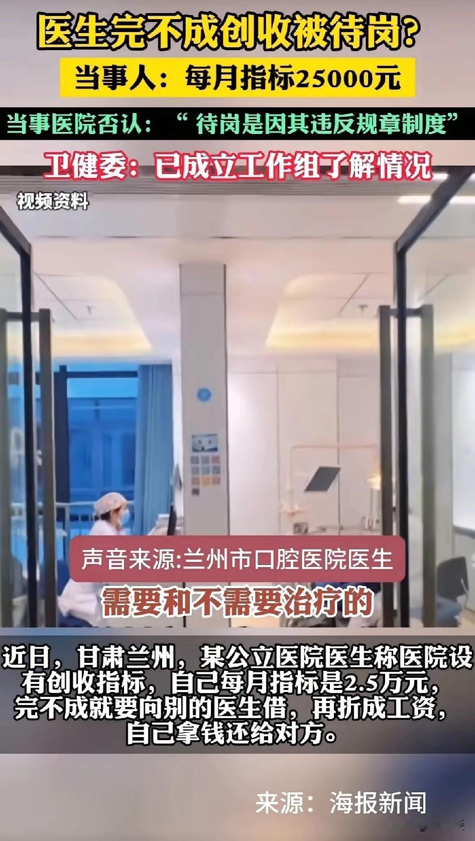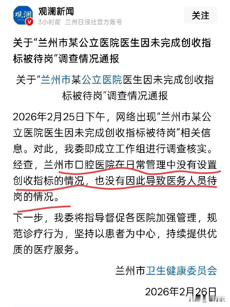 网友爆料,甘肃兰州某医院医生有创收任务,如果完不成创收任务,那么就要被待岗,并且提出每位医生的待岗任务是 2 5000 元每月,当地卫健委立刻介入调查,并且及时地发布了调查结果,称该医院并没有设置创收指标的情况,因此,也不存在因为未完成创收任务而待岗的医生。也就是说,同一件事情,出现了两种截然不同的说法,究竟该相信谁呢?这所医院到底有没有给医生设置创收指标呢?很模糊,不过作为官方主管机构,必然是经过严格细致的调查才得出的权威结论,因此对于卫健委调查报告更应该相信,具有更大的可信度。