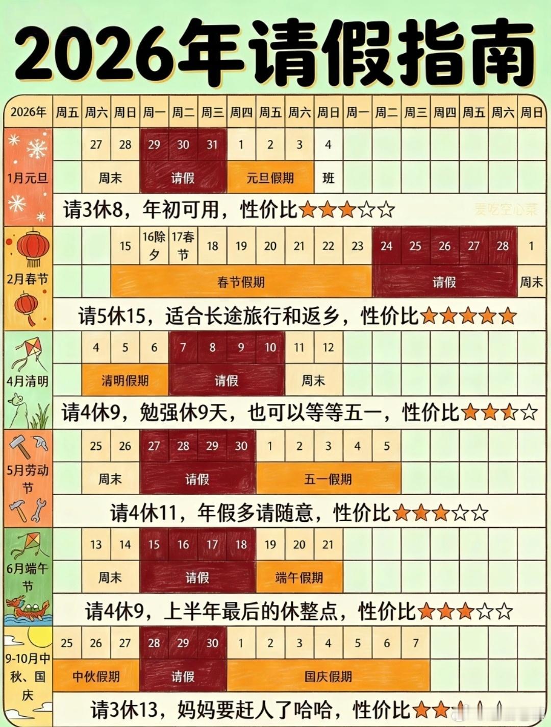 2026请假指南,最长可连休13天!看看接下来的五一、端午、国庆该怎么连休最划算