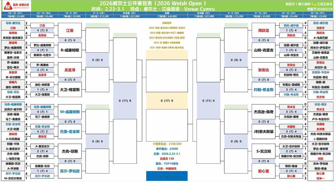 劳模!球员锦标赛冠亚军双双晋级威尔士公开赛16强,大概率要会师半决赛。 赵心童4-2斯坦穆迪 希金斯4-3雷维斯 威尔士公开赛16强全部出炉,中国球员占据5席。预测几人晋级八强? 江俊—罗比威廉姆斯 吴宜泽—大卫格雷斯 周跃龙—克雷吉 张安达—希金斯 赵心童—宾汉姆