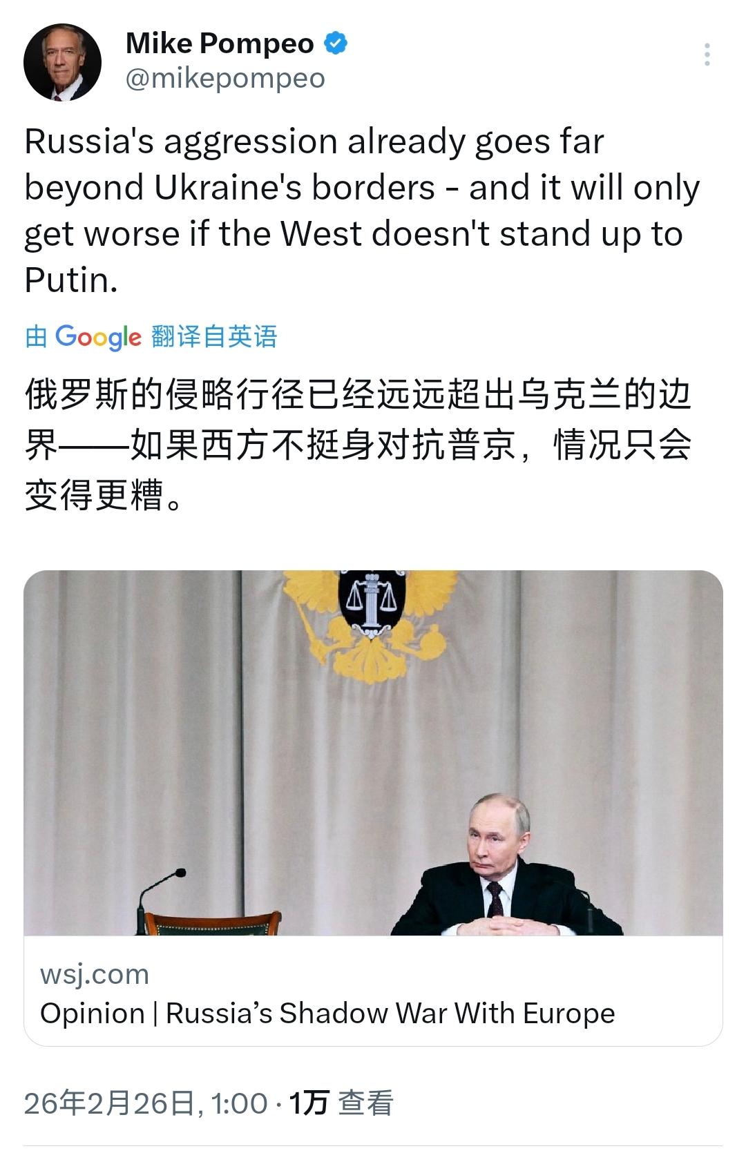 越来越瘦的美国前国务卿蓬佩奥今天(北京时间2月26日)写道:“俄罗斯的侵略行径已经远远超出乌克兰的边界——如果西方不挺身对抗普京,情况只会变得更糟。” 【蓬佩奥还转发了华尔街日报的评论文章:“俄罗斯与欧洲的影子战争”】 [机智]评几句:一直以来,蓬佩奥刻意炒作渲染俄罗斯的目标不止乌克兰,还会染指波兰、波罗的海三国等东欧国家,这其实是美式霸权的惯用套路。本质就是制造恐慌、绑架欧洲、兜售军火、延续对抗。这种危言耸听不是为了欧洲安全,而是为了把欧洲牢牢绑在美国的战车上。蓬佩奥之流不断煽动对立、制造紧张,只会让欧洲局势更加危险,其真实目的就是维护美国霸权私利,这样的言论除了挑拨离间、祸乱地区,毫无半点可信度。