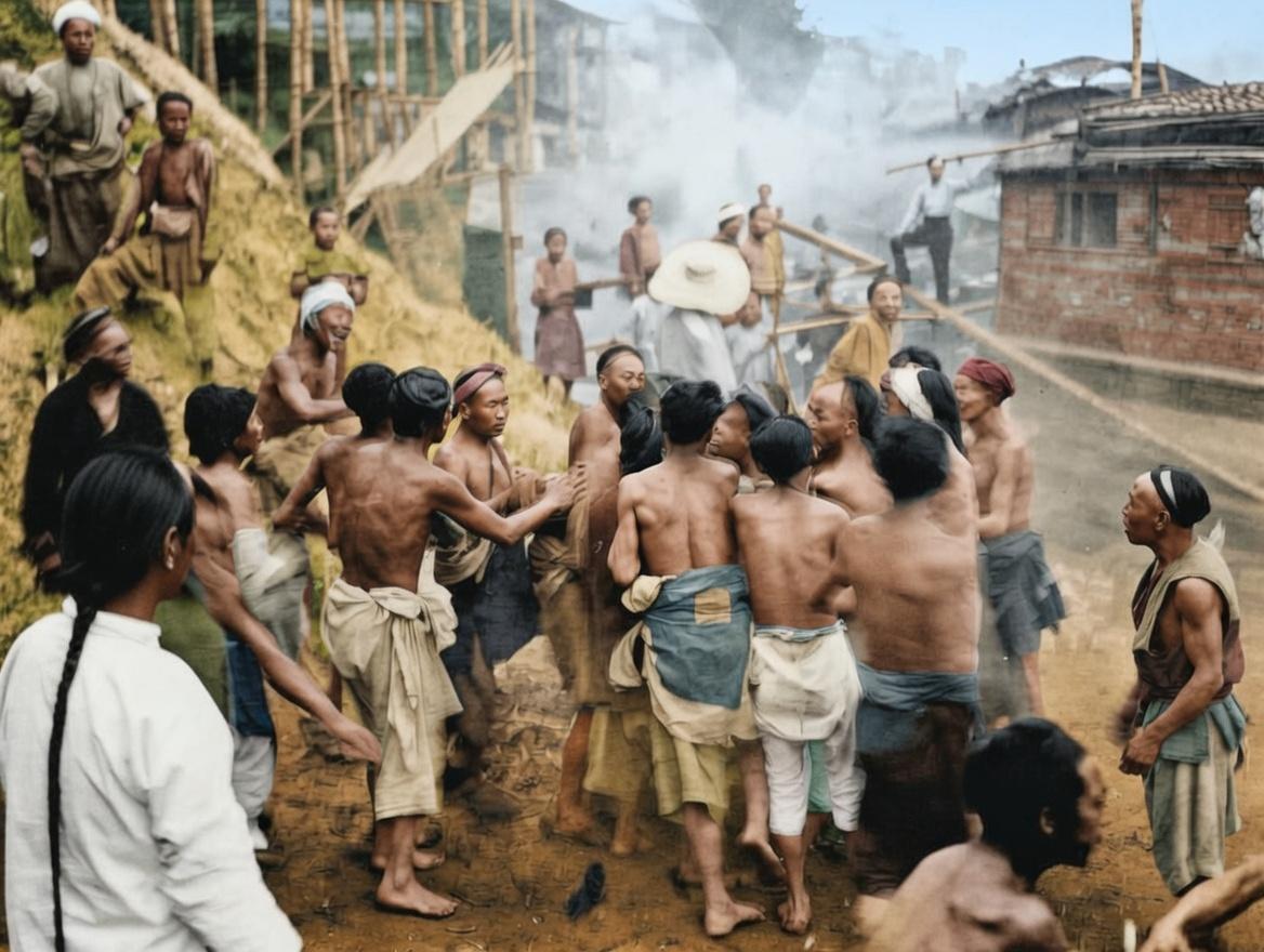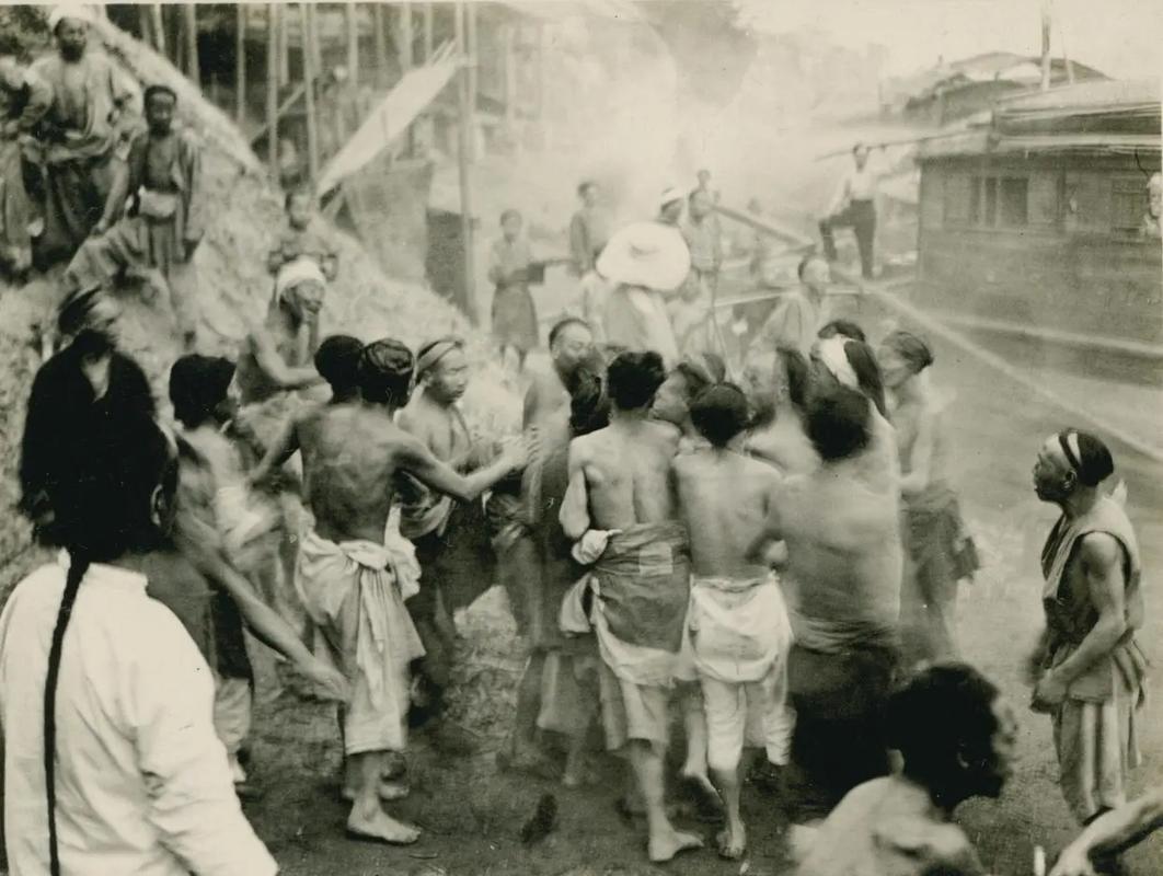 1909年,四川嘉定府(今乐山),美国地质学家罗林·张伯林在四川考察期间拍摄乐山码头一场激烈的斗殴冲突。 数十名赤膊的底层男性,大多仅在腰间围了简易围布/短裤,正扭打推搡在一起,动作幅度极大,现场氛围紧张;四周、坡地高处还有大量围观的民众,这类冲突的起因,大多是码头脚夫、搬运苦力等底层民众,为争抢活计、生计地盘而发生的械斗,是晚清底层生存困境的直观写照。 晚清时期的四川,官府苛捐杂税繁重,民生凋敝,大量底层民众只能靠出卖苦力谋生,有限的生计资源极易引发冲突,也造就了当地强悍的民间风气。