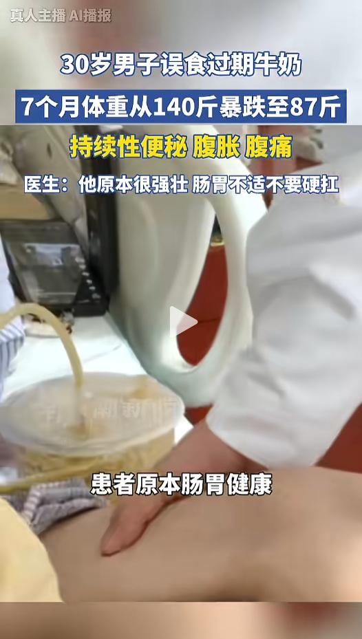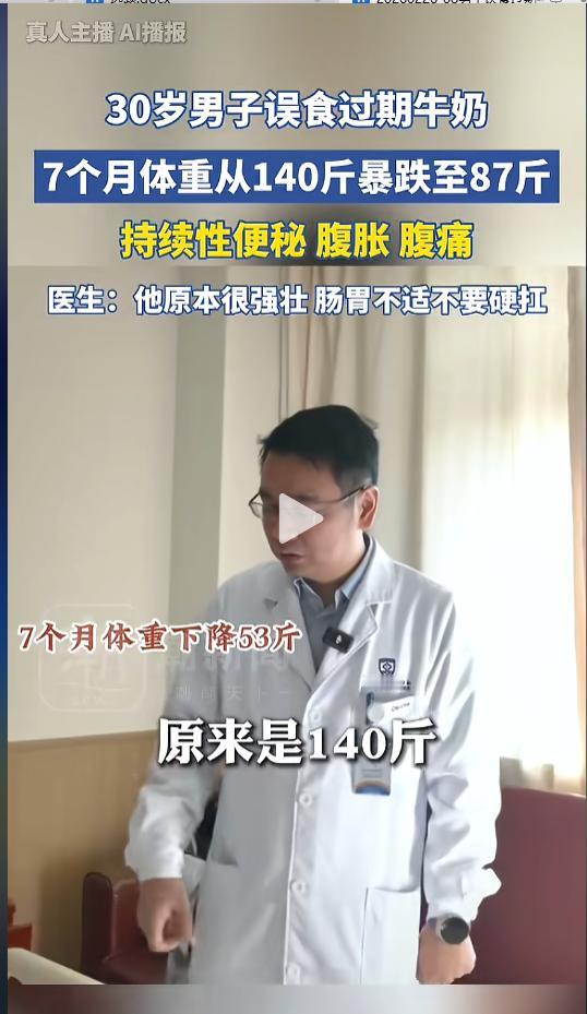 “可长点心吧!”近日,上海,一三十岁男子到医院就诊。该男子以前肠胃很健康,七个月前,误食了一瓶过期牛奶。从那之后,就一直腹胀腹痛,还出现了持续性便秘。七个月间体重降了53斤,这才到医院就诊。网友:减肥新途径? 都知道过期食品不能吃,有时候因为舍不得浪费,或是粗心没注意生产日期,总会出现一些误食的情况,这也导致了一些意外的发生。 据媒体2月24日报道,该男子以前体重140斤,肠胃很健康,身体也很强壮。七个月前,男子误喝了一瓶过期牛奶,之后便出现了腹胀腹痛的情况,还伴随着持续性便秘。 从那以后,男子的肠胃就一直不通畅,只是他一直忍着。短短七个月的时间,他的体重降到只剩87斤,暴瘦53斤,变得浑身骨瘦如柴,这才去医院就诊。 医生说,正是过期牛奶里面的致病菌,导致男子的结肠动力完全丧失。误食过期食品后,一旦出现肠胃不适,要及时去医院就医,千万别硬撑着。 这种病理性暴瘦,是身体发出的预警,当它出现的时候,就意味着身体已经患病了,一定不能忽视,否则可能对身体造成不可逆的危害。 网友看后表示,这人心怎么这么大呢,都瘦成这样了才去医院,对自己也太不负责任了。 在这里也提醒大家,一定要注意家里食品的保质期。放时间太久的,保质期不明确的,宁可扔掉也不要塞进嘴里。自己的身体健康比什么都重要! 信息来源:《男子误食过期牛奶后,七个月体重骤降53斤》潮新闻