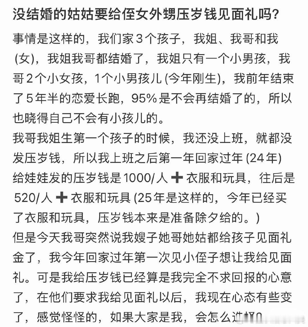 没结婚的姑姑要给侄女外甥压岁钱见面礼吗