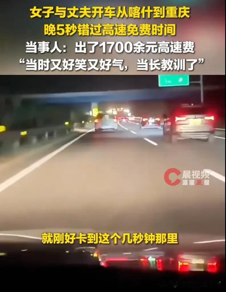 太心疼了!2月24日,重庆张女士两口子自驾3700多公里回老家,本以为能省下一大笔过路费,没成想临门一脚,竟然败在了短短的5秒钟上。 张女士两口子从新疆喀什自驾回重庆,3700多公里路,开了40个小时,眼皮都快粘在一起了。截止前下道,省笔不小的过路费。谁能想到,就差那5秒钟——车子过闸机时,时间跳到了2月24日零点零5秒。 系统不认人情,前一秒还能免费的路程,瞬间变成全额收费。1724块,就这么从口袋里飞了。张女士说,当时心里像打翻了五味瓶,3000多公里都熬过来了,偏偏栽在这眨眼的功夫里。 这事传到网上,网友们炸开了锅。有人说,高速免费的截止线比高考还严,机器只认数字不认人,差几秒就全价,换谁都得心疼。 还有人想起自己类似的经历:去年国庆,离免费结束差20分钟,结果遇上收费站堵车,眼睁睁看着时间跑过零点,多交了好几百。 老司机们倒是给出了实在招:真赶不及,千万别硬闯。就近找个出口下去,重新领卡再上来。这样3000多公里的大头能省下,只掏最后一小段的钱,总比1724块的“冤枉钱”强。 这法子听着简单,可真到了那会儿,急着回家的人往往想不到——心里只想着“再快点,说不定能赶上”,结果一头撞上截止时间。 每年高速免费结束前,都会有类似的事儿上演。就像有人抱着“赌一把”的心态,踩着点往收费站冲,结果不是被前车堵了,就是差几秒超时,最后追悔莫及。 其实细想,这哪是赌时间?是赌自己的辛苦钱啊。张女士两口子这40个小时,估计没少熬通宵。方向盘轮流把,服务区囫囵吞口饭,眼里就盯着“免费”俩字,想把赶路的辛苦,从过路费里补回来。 可系统的代码不认这些,它只看时间戳——零点零分零秒一过,该多少是多少。有人说这规矩太死,就不能通融几秒? 可规矩要是能随便通融,今天对张女士送5秒,明天就能对别人送10秒,到最后免费时段变成“模糊地带”,反而更乱。高速收费靠的是机器,不是人工估摸着来,这也是为了公平——总不能让先到的人等,后到的人蹭吧? 说到底,还是得自己多留个心眼。长途赶路,别把算盘打得太满。就像老话说的“赶早不赶晚”,与其赌最后几分钟,不如提前规划。 比如张女士这趟,要是早出发半小时,或者中途多休息会儿,别硬撑着赶时间,说不定就能稳稳蹭上免费的末班车。 退一步说,就算真赶不及,老司机的法子其实很管用。高速上每隔一段就有出口,看见时间不对,果断下去再上来,损失能降到最小。怕就怕“舍不得”那点绕路的时间,结果亏了更大的。 1724块,对谁都不是小数目。够给车子加几箱油,够一家人吃顿像样的饭。就因为5秒钟没算好,白白花出去,换谁都得念叨半天。可这事也像个提醒:出门在外,计划得比变化快。别让“省”的心思,最后变成“亏”的遗憾。 张女士的经历,估计能让不少人记牢:高速免费的尾巴不好蹭,与其追着时间跑,不如多留份从容。毕竟,回家的路再急,也犯不上跟5秒钟较劲——钱花了能挣,可路上的平安和舒心,比啥都金贵。 消息来源:@红星新闻