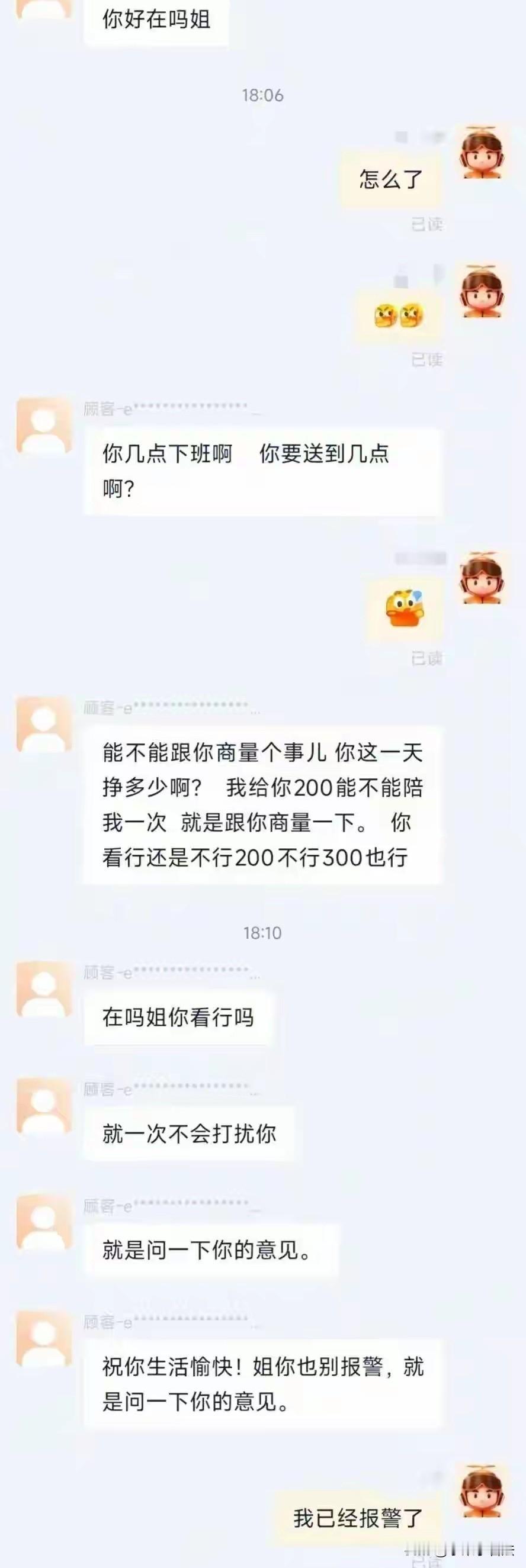 “偷鸡不成蚀把米!”上海,00后女骑手爬至5楼给一20岁男顾客送外卖,到了发现他早就等在门口,她递过去外卖就下楼。谁知,紧接着她收到那个顾客连续发来的信息,问她几点下班,问她一天赚多少钱,能不能200元陪他一次,不行300也行,还告诉她不要报警。这类信息半个小时发了57条!女子忙着送外卖还不停被打扰,她一怒报了警!男顾客主动赔偿300元求原谅!网友: 拒绝不就行了,干嘛啥都不说就报警呢?说陪也不犯法吧! 2月22号傍晚六点多,正是晚高峰最忙的时候,00后外卖骑手小葛骑着电动车穿梭在车流里,手机里的订单提示音响个不停。 那天她跑单跑得脚不沾地,送到一个老小区时,订单显示要送到五楼,还没有电梯。 小葛没多想,拎着餐盒就往楼上爬,心里只想着快点送完,别让顾客等急了,也别耽误后面的单子。 等她气喘吁吁爬到五楼楼梯口,一下子就愣住了,收货的男顾客竟然早就站在那儿等着了。 楼道里光线不算亮,对方年纪看着不大,就站在门口盯着她,小葛心里莫名有点发紧,但还是礼貌地把订单递过去,说了句“您的外卖”,转身就想赶紧下楼。 她做骑手也有段时间了,一直都很谨慎,送完餐从不多停留,更不会和顾客有多余交流。 可她刚走到三楼,手机就开始不停震动,一条接一条的消息弹了出来。发消息的正是刚才那个五楼的男顾客。 一开始对方还装作闲聊:你好在吗姐?你要送到几点?你几点下班啊?能不能跟你商量个儿, 你这一天挣多少啊? 小葛本来就忙,压根不想理,可对方越说越离谱,直接抛出一句让人恶心的话:我给你200块,你陪我一次行不行。 看到这句话的瞬间,小葛又气又懵,一股无名火直往上冲。 她跑外卖是凭力气赚钱,堂堂正正,怎么能被人用这种肮脏的想法侮辱?她强压着怒火,没有回消息,只想赶紧把剩下的单子送完,远离这种烂人。 可她不回应,对方反而变本加厉。你看行还是不行200不行300也行?在吗姐你看行吗?就一次不会打扰你,就是问一下你的意见。 短短半个小时,手机消息提示音就没停过,数了数,竟然发了57条消息。 一开始是不依不饶的骚扰,后来看小葛始终不搭理,又开始疯狂道歉说请她吃饭:祝你生活愉快!姐你也别报警,就是问一下你的意见。 消息一条接一条轰炸,手机震得小葛手心发麻,后台的提示音吵得她头都疼。 那时候她还在路上骑车送单,一边要盯着路况,一边被消息烦得心乱如麻,注意力根本集中不起来。 有一次过马路,她下意识瞥了一眼手机,差点被侧面开过来的车撞到,电动车猛地一歪,她惊出一身冷汗。 现在想起来都后怕,要是真出了事,后果不堪设想。 越想越生气,越想越委屈。小葛觉得,自己靠双手赚钱,没偷没抢,凭什么要受这种委屈? 很多女孩子遇到这种事,可能会觉得丢人,选择忍气吞声,但小葛偏不。 她送完当天所有订单后,没有丝毫犹豫,直接拨打了报警电话。然后给那个男顾客发了信息:我已经报警了! 她心里只有一个念头:我不要钱,也不要什么道歉请吃饭,我就要让他知道,这种骚扰行为是错的,必须受到惩罚。 警察很快赶到,陪着小葛一起上门找到那个男顾客。 一见面,对方就慌了神,低着头不停道歉,态度放得特别低。 小葛当着警察的面,明确告诉对方,她不接受私下和解,也不要任何赔偿,只希望他为自己的行为付出代价。 在警察的调解和批评教育下,男顾客知道自己闯了祸,也清楚骚扰他人的严重性,主动提出要赔偿300元,弥补自己影响小葛工作、给她造成困扰的过错。 小葛本来不想要这笔钱,但她觉得,做错事就不能零成本摆平,300块不多,却是一个教训,让他记住不能随便骚扰别人。 直到警察登记身份信息时,小葛才知道,这个骚扰她的男生是2005年的,才20岁,甚至和她还是同乡。 知道这个信息的时候,小葛又无奈又唏嘘,年纪轻轻,心思却这么不正,同为老乡,做出这种事,实在让人失望。 好在报警之后,对方再也不敢发消息骚扰她,生活终于恢复了平静。 后来小葛接受采访时,说得特别实在:“我虽然跑外卖,但我还有其他工作,一天收入也不低,根本不差这几百块钱。 女孩子被欺负了,一点都不丢人,错的是那些骚扰别人的人。该发声的时候一定要发声,不要忍,忍了一次,就会有第二次。 《民法典》第1010条:违背他人意愿,以言语、文字、图像、肢体行为等方式对他人实施性骚扰的,受害人有权依法请求行为人承担民事责任。 对方提出200元换陪伴一次,以文字、言语方式实施与性相关的不当提议。属明显性暗示。 小葛的勇敢,不仅是为自己讨公道,也是在告诉那些心怀不轨的人:尊重别人,是最基本的底线。 有人说,200元陪伴一天 怎么想都想不到是性骚扰!就解释一下陪就是陪打王者荣耀! 有人说,啥也没得到,还赔偿300元,偷鸡不成,蚀把米!也不警告下,上来就报警,不地道! 对此您怎么看?