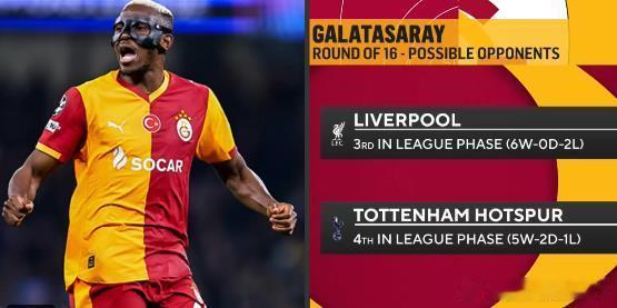 根据此前抽签规则,加拉塔萨雷将肯定作客英格兰,将在16强战对阵利物浦或者热刺。而数据统计显示,加拉塔萨雷近14个欧战客场仅取得1胜3平10负,最近7场比赛1胜6负。