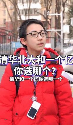 回到学生时代,清华和一个亿你怎么选? 这段视频是随机采访中小学生,问他们:上清华北大和给你一个亿,让你二选一,你选哪一个?采访过程中,金句迭出,比如: 1,选清华,因为有钱也不意味能找到工作。 2,选清华,因为上清华后,赚一个亿就很简单。 3,一个亿也没多少钱,我爸一个多月就能赚到。 但也有两个孩子选一个亿! 你怎么回答这个问题?