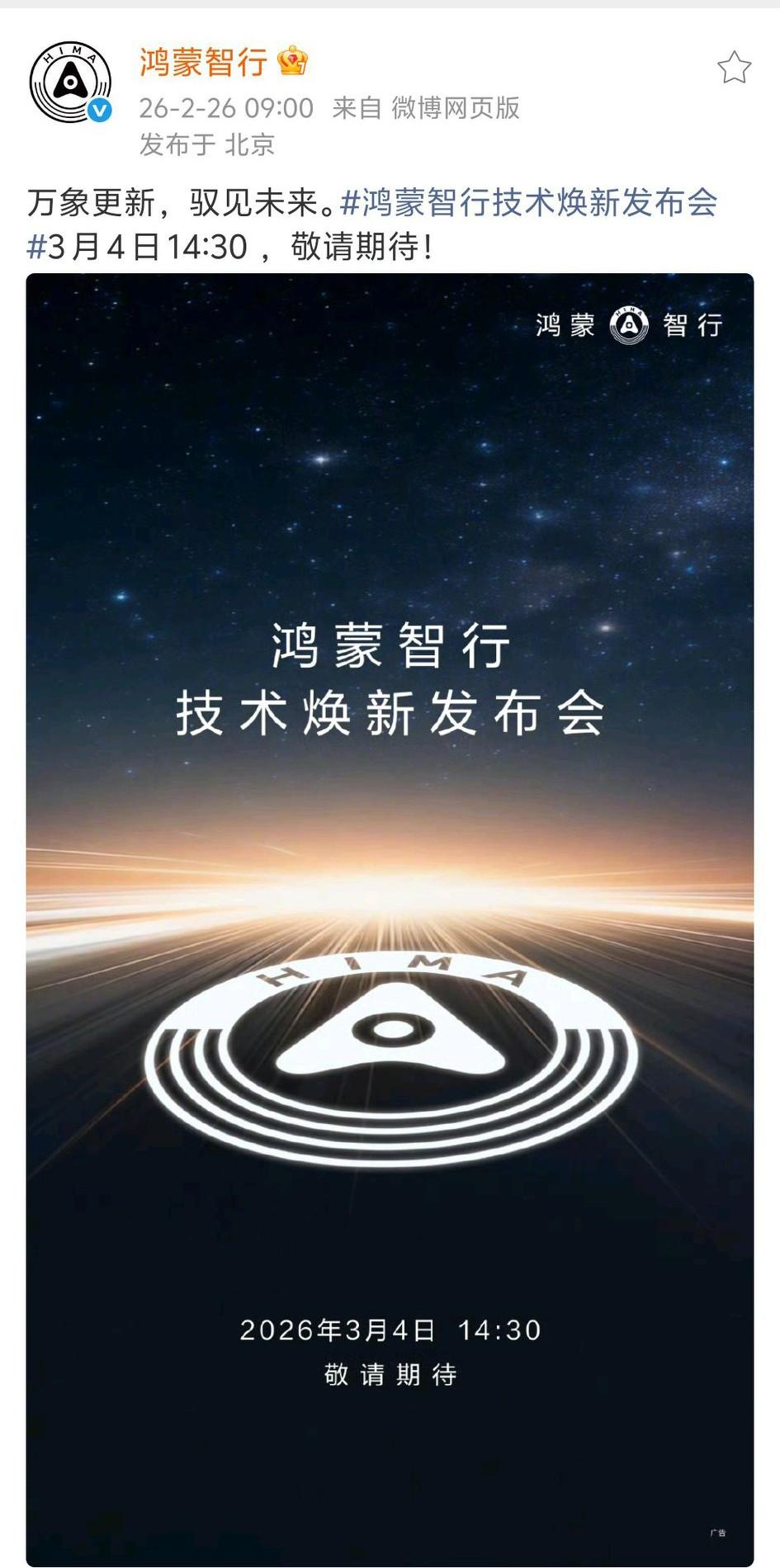 竞争对手又要睡不着了,不怕余承东大嘴,就怕余承东什么也不说啊。 华为鸿蒙智行官宣了2026年开年的首场发布会,名称就叫“鸿蒙智行技术焕新发布会”,时间:3月4日 14:30。官方宣传语只有八个字:“万象更新,驭见未来”。 官宣海报上没有什么温馨提示,也没有什么核心剧透,简简单单的“敬请期待”四个字,字少事大啊! 虽然鸿蒙智行对这场“技术焕新发布会”秘而不宣,但明眼人都懂,这肯定是华为在智能汽车领域又一次强力的技术输出,将进一步巩固其在智驾赛道的领先地位。 而且,技术焕新也将为五个界品牌的合作车企提供更强的产品竞争力,推动合作伙伴向“自主智能”跃迁。 特别是即将上市的智界V9、尚界Z7、问界M6等新品,会不会率先搭载华为的什么最新技术?太让人期待了。华为入局智驾的鲶鱼效应 余承东 华为鸿蒙智行 鸿蒙智行