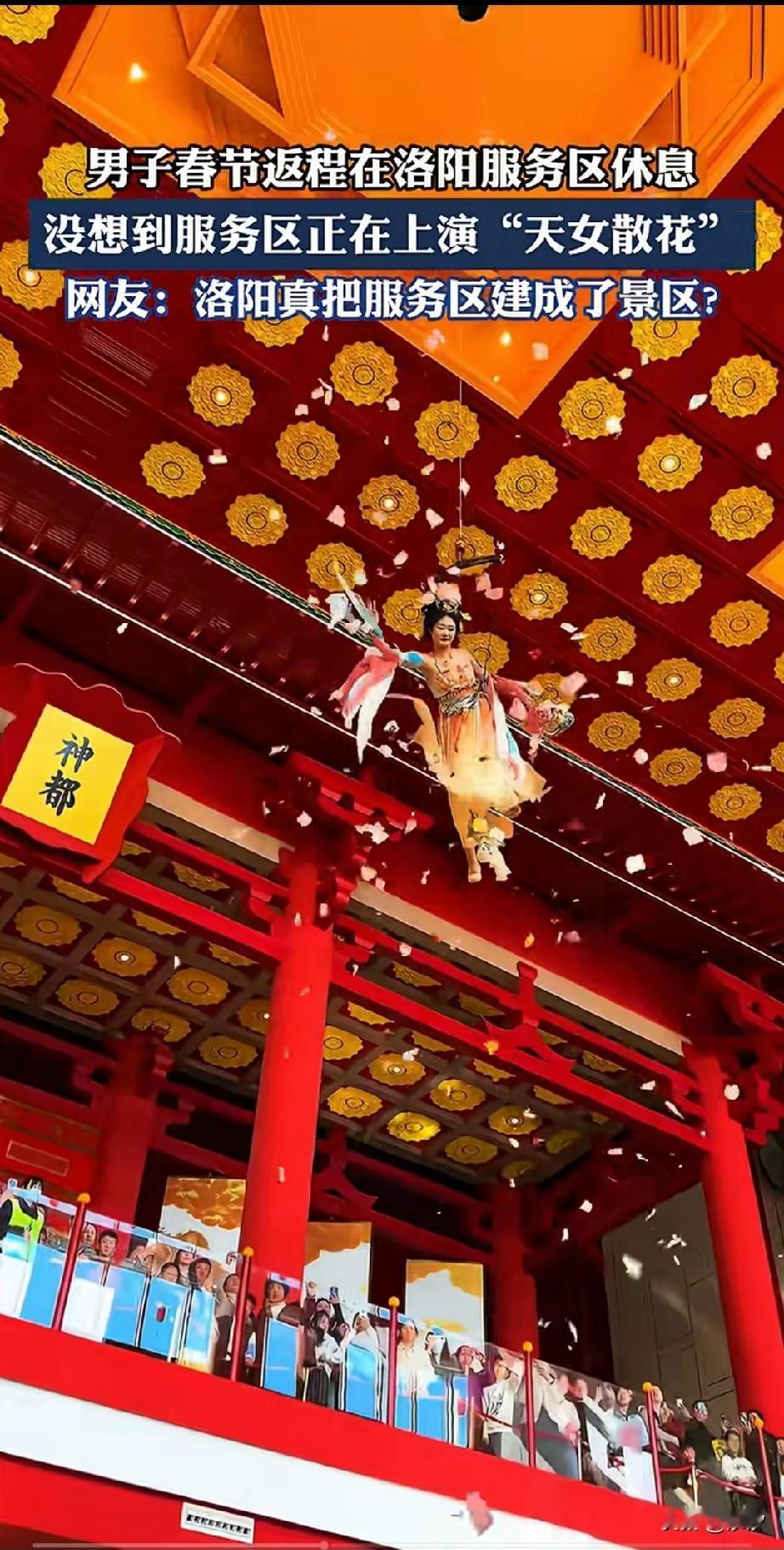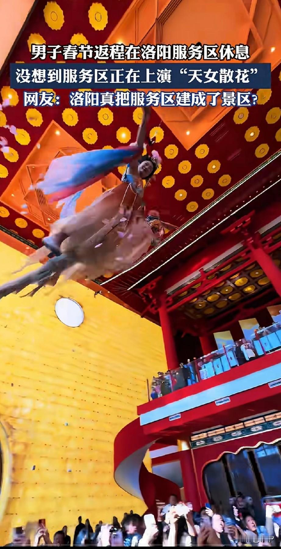洛阳的高速服务区不得了, 男子在洛阳高速服务区休息, 结果碰到服务区内部上演的节目, 就是著名的天女散花, 现场很多司机都在围观, 女演员吊着威亚, 从高处飞来飞去, 还在不停的撒着花瓣, 直接把人都看傻了, 这节目不止只有景区有, 连高速服务区都有, 洛阳直接把高速服务区办成了景点, 天女散花的节目实在太精彩了, 现场观看非常的棒, 这个节目直接获得了很多游客的喜爱, 除此之外还有其他的各种节目, 全国服务器也只有洛阳服务器敢这么做了,它不愧是 神都! 大家对于这样的服务区怎么看? 洛阳天女散花 洛邑天女散花 洛阳花神造型 洛阳必看表演 洛阳团建旅游