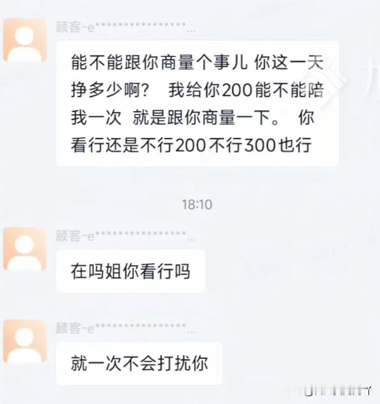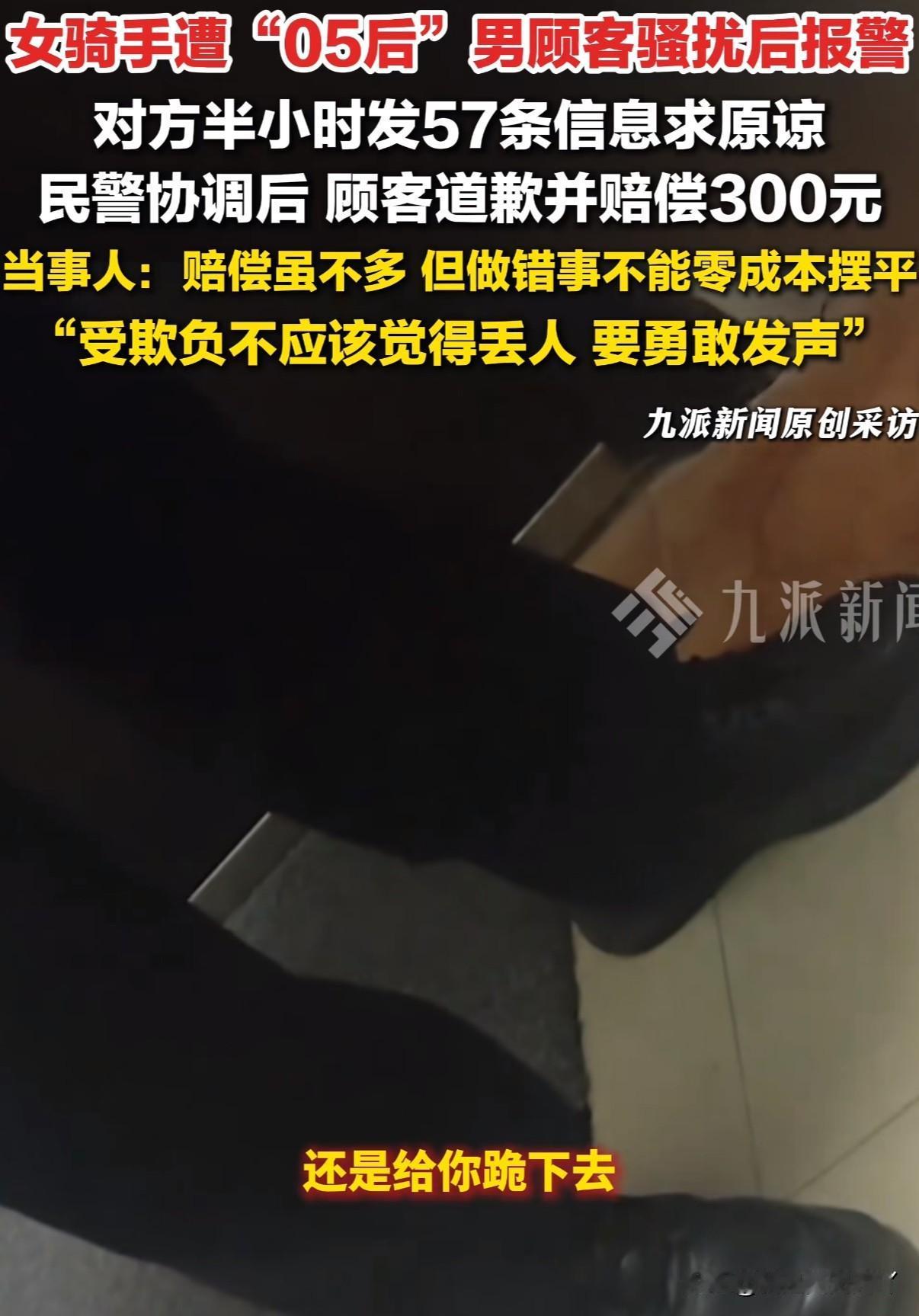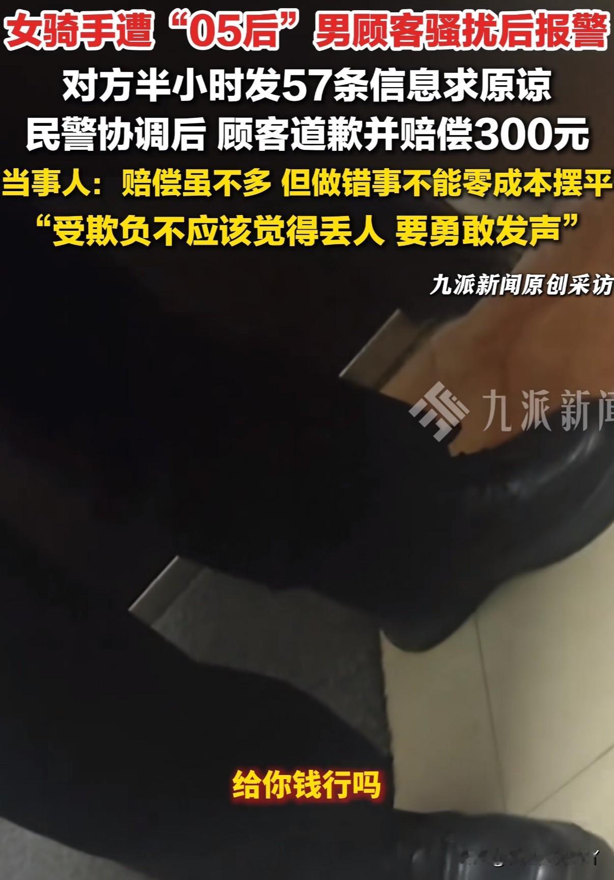 女外卖员遭点餐男子发信息询问200元陪我一次可以吗?200不行给你300 2月22号上海00后外卖女骑手小葛送餐后收到点餐男子发来骚扰信息,对方先是询问小葛送一天外卖能赚多少钱,小葛没理会对方又发来信息提出让小葛陪他一次他可以出200块钱,200不行他也可以给300,还说就一次过后绝不打扰 小葛表示自己已经报警后点餐男子接连发几十条信息道歉请求原谅 在警方介入下点餐男子向小葛道了歉并赔偿小葛300元 小葛表示钱虽然不多但她必须要,做了错事仅道歉就可以原谅的话且不是零成本