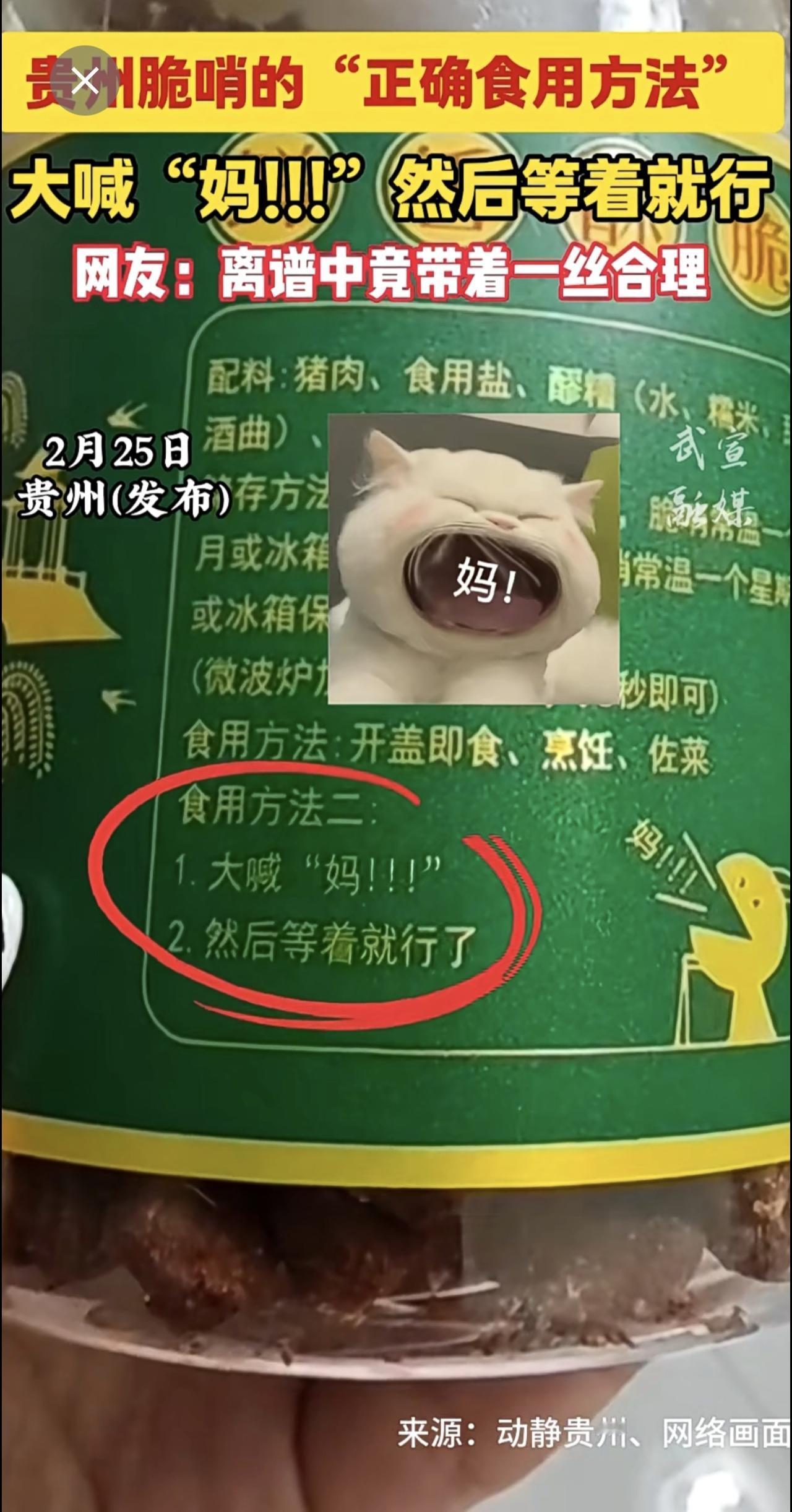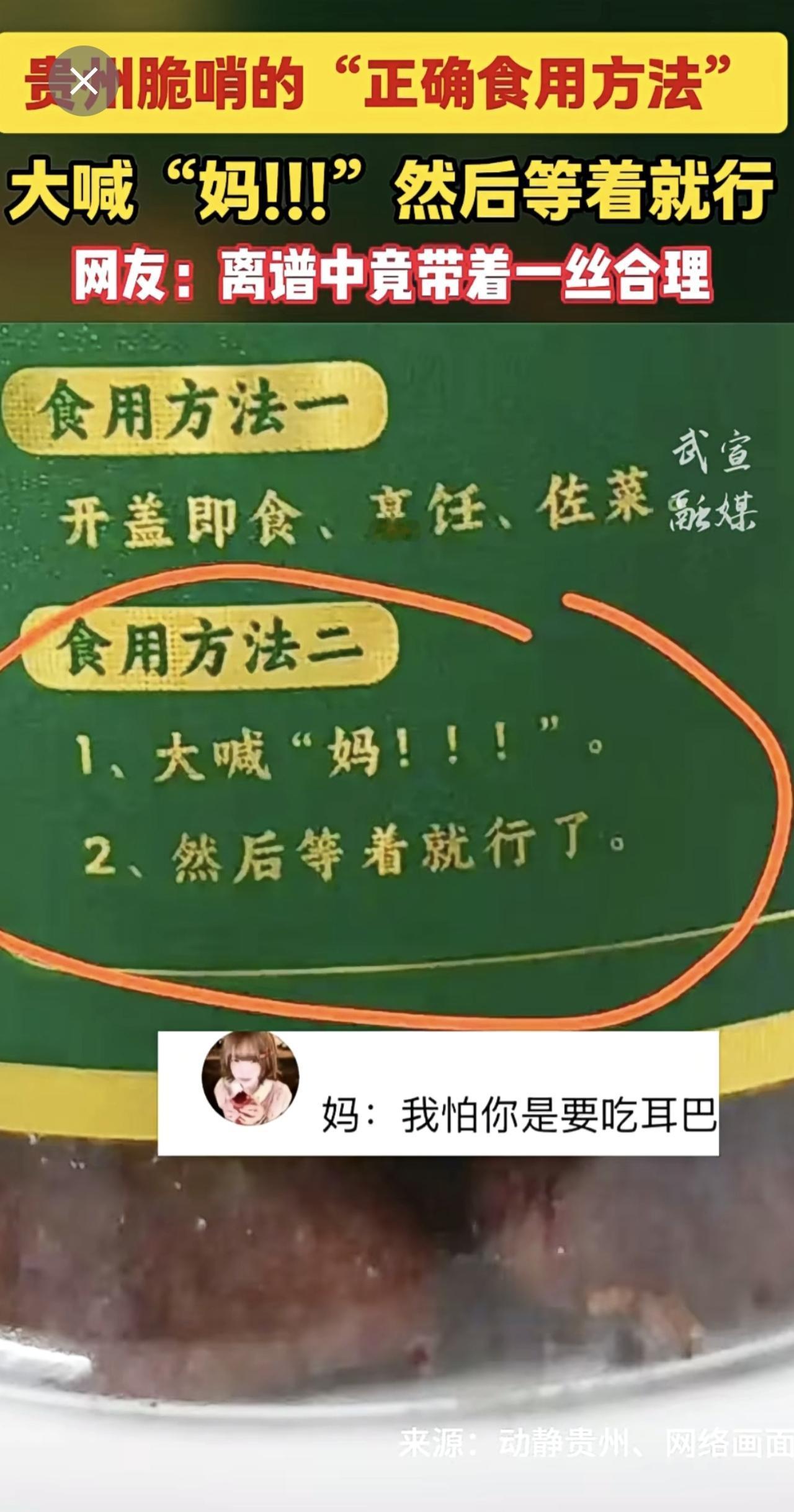 贵州脆哨的“正确食用方法”:大喊“妈!!!”然后等着就行。网友:离谱中竟带着一丝合理。