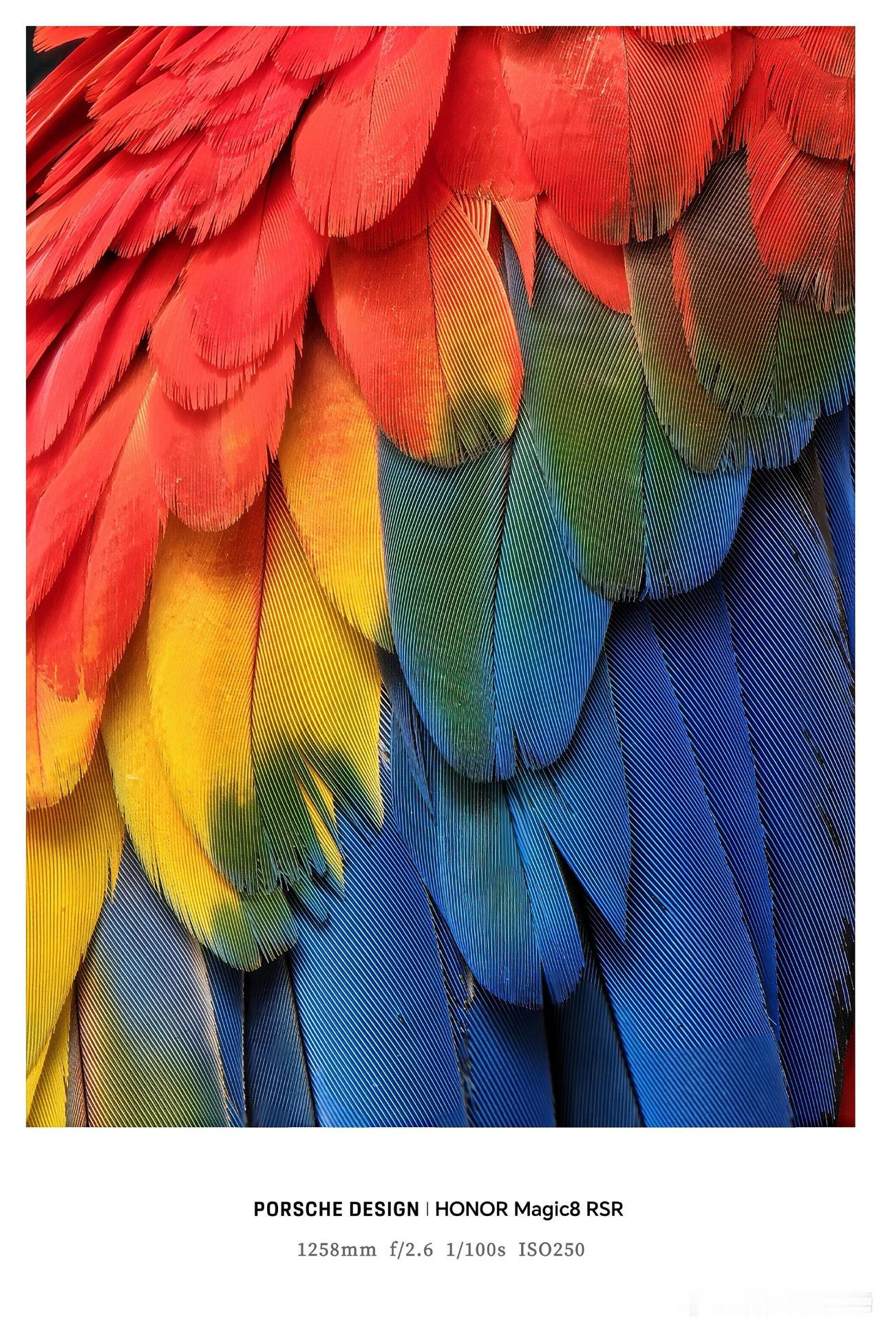 现阶段荣耀影像天花板就是:荣耀Magic8 RSR保时捷设计了,1/1.4英寸大底和OIS光学防抖的加持让这款机型提升了影像能力,刚刚看到荣耀性能优化研发工程师阿勇,分享了一张此机型拍摄的五彩金刚鹦鹉羽毛特写,1258mm 等效焦距、f/2.6 光圈、1/100s 快门、ISO250的拍摄参数,2亿像素潜望长焦镜头,清晰地展现了羽毛的羽小枝结构,大家是不是第一次清晰的看到羽毛的特写呢?畅聊数码新品 数码资讯