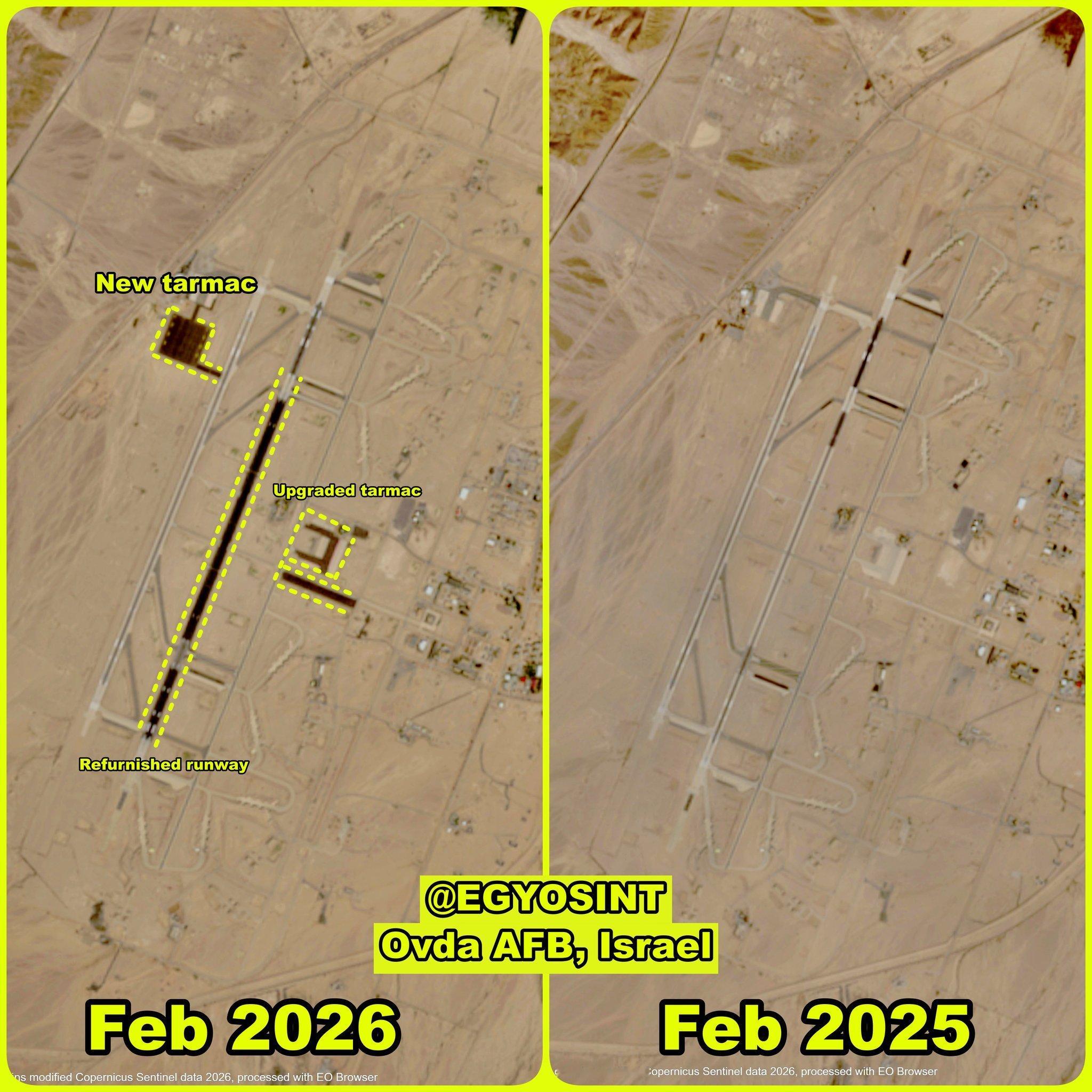 🔻福特号抛下护航军舰火急火燎赶到东地中海,原来是急着上厕所而不是打伊朗。🔻希腊克里特岛苏达湾港口码头上搭建起了福特号舰员下来休息的临时帐篷和临时厕所。🔻目前美军11架F-22战机和数十架加油机已经部署至以色列南部的奥达夫空军基地,新一批13架F-22战机也抵达了英国,准备向以色列转场。🔻以色列奥达夫空军基地在数月前就进行了翻修,新建停机坪,可见美以早有预谋。
