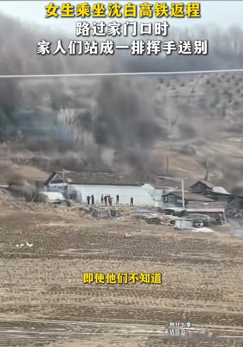 看后心里直发酸!吉林通化,一位女生坐着高铁返程上班,本以为就是一次普普通通的离家,没成想往窗外看了一眼,瞬间眼泪控制不住了。这一幕彻底感动了全网,网友齐刷刷的说,振兴东北! 这位女生走之前特意买了一张靠窗的F座,临行前只是随口跟家里提了一嘴,说下午两点多列车刚好会路过咱们村。她自己压根没往心里去,毕竟高铁嗖的一下就过去了,平时大家都忙,谁会专门跑出来看这一眼呢。 结果列车刚开近村口,她下意识地凑到窗边一瞥,直接破防了。 只见爸妈、爷爷奶奶还有弟弟妹妹,一大家子人整整齐齐地站在田间地头上,冲着列车的方向拼命挥手。就为了这短短几秒钟的照面,一家老小不知道在冷风里等了多久,一直到火车彻底消失在视线里,那几个熟悉的身影还在那里站着。 视频发到网上,瞬间戳中了无数人的泪点。 有网友触景生情,回忆起以前自己离家时,奶奶也是这样趴在窗口一直摆手,等后来全家决定好回老家给她养老时,老人却已经不在了。 也有网友一针见血地道出了背后的心酸,说东北的孩子想家念家恋家,唯独留不住家,三十年前大家去东北打工,现在东北孩子去外地打工,这真是三十年河东三十年河西。 不得不说,这种隔窗相望的画面,现在真是看一次让人哭一次。 其实往简单了说,父母长辈们早早守在列车必经的田埂上,图的根本不是那一秒钟的看脸,那是对远行孩子永远也割舍不下的牵挂。他们心里比谁都清楚,这一声汽笛响过,再想聚齐一大家子,又得等到明年除夕了。 虽然为了讨生活,当年父辈们背井离乡闯关东,如今孩子们又迫不得已再闯回去,但这份化不开的家乡温暖,永远是他们在外面硬扛的底气。 真心盼着咱们的东北老家能越来越好,让这些可怜又坚韧的东北娃,以后在家门口也能把日子过得红红火火。 最后我也想说一句,振兴东北!