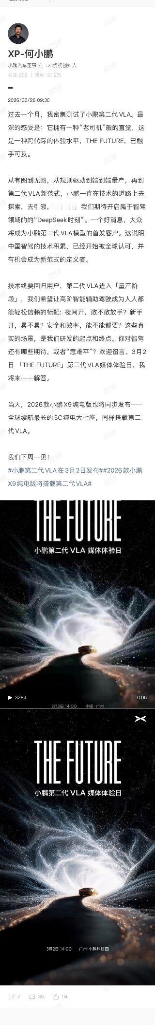 小鹏汽车宣布:第二代VLA将于3月2日发布,同步开启试驾,3月内量产推送。何小鹏称其具备“老司机”直觉,实现跨代际智驾体验,从规则驱动迈向端到端新范式,开启通往L4完全自动驾驶的大门。2026款小鹏X9纯电版将搭载该系统,作为全球续航最长5C纯电大七座,产品力看齐增程版,实现“一车双能”。
