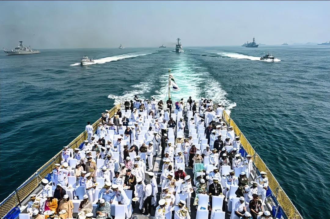 这是今年2月在印度维沙卡帕特南部外海举办的2026年国际海上阅舰式的现场,是印度最高规格的海军盛典与外交活动。 这个拍摄视角位于印度海军检阅舰的尾部甲板,甲板上整齐布置了白色观礼座椅,坐满了身着白色海军礼服的印度海军官兵、多国海军代表团成员与受邀嘉宾,也有身着深色制服的军官。 这次2026年国际海上阅舰式,是印度独立以来第三次举办该盛典,也是印度首次将国际阅舰式、MILAN2026多国海军演习、印度洋海军论坛峰会三大国际海事活动同期举办,规模创下了历史新高。 活动由印度总统作为武装部队最高统帅主持检阅,共有来自近70个国家的海军参与,总计85艘舰艇,其中含19艘外国军舰。 在广阔的海面上,多艘印度海军主力舰艇、外国参演军舰以及高速巡逻艇组成编队,部分舰艇正在高速机动,呈现出阅舰分列式的航行状态。