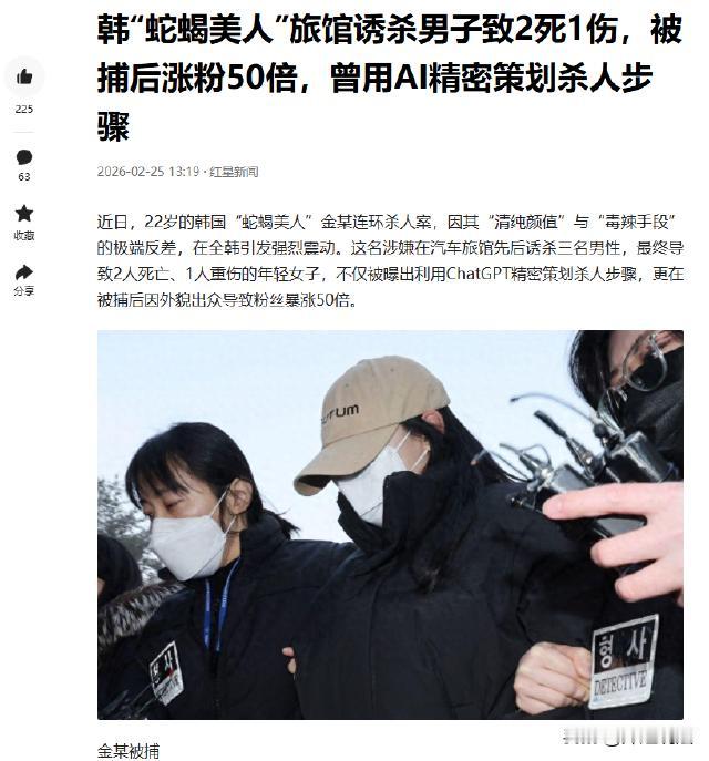 22岁女子金某,外表甜美却心肠歹毒。她用AI策划犯罪,把目标对准20多岁年轻男子,第一个下手对象竟是男友。她以各种理由将男子约到旅馆,递上掺了东西的饮料,致其死亡。之后她愈发疯狂,用同样手段又害两人死亡、一人重伤。被抓前,她还在物色新目标。更离谱的是,就因长得漂亮,她社交平台还涨了50粉。如此恶劣行径,实在让人愤怒。 (本信息来源:红星新闻) 这事发生在2024年,韩国。 金某才22岁,刷到她社交账号的人,没人会把她和恶魔联系起来。 照片里的她,看着干净又甜美,日常发的也都是穿搭、音乐之类的琐事,看着和普通年轻女孩没两样。 谁能料到,这份甜美皮囊下,藏着一颗冷血到极致的心。 她没靠一时冲动作案,反而动了心思,用AI一步步策划。 警方后来查到,她多次在AI上搜索,问过量吃安眠药会不会死人,喝酒后吃安眠药有啥后果。 AI明明已经告诉她,这样可能致死,她却半点没停,反而在后来的作案里,加了更多药物剂量。 这根本不是失手,是早有预谋。 她选的目标很固定,全是20多岁的年轻男子。 第一个遭殃的,偏偏是她的男友。 她找了个借口,把男友约到江北区的一家旅馆。 见面后,她递过去一瓶饮料,语气还是平时的温柔模样。 男友没半点防备,接过就喝了。 没一会,男友就开始痛苦挣扎,浑身无力,最后没了呼吸。 金某就站在旁边看着,没有一丝愧疚,甚至连眉头都没皱一下。 杀了男友后,她不仅没收敛,反而愈发疯狂。 她故技重施,又约了两个20多岁的男子,还是在旅馆,还是递上掺了药的饮料。 这两个人,没能像她男友那样,成为第一个受害者,却也没能逃过死亡的命运。 还有一个男子,运气好一点,没被害死,却也受了重伤,留下一辈子的阴影。 警方后来检测,死者体内有多种且大量的混合药物成分,都是金某提前在家配好的。 她被抓后,还嘴硬,说自己只是想让他们睡着,不是想杀人。 这话谁信?提前配好毒饮料,查好致死剂量,连续作案,这分明就是蓄意谋杀。 更让人愤怒的是,她作案期间,社交账号还一直活跃着。 直到被逮捕前30分钟,她还在发限时动态,打着重逢、互粉的标签。 警方推测,她那时候,还在物色下一个目标。 案件曝光后,她的社交账号被扒了出来。 让人三观尽毁的是,就因为她长得漂亮,粉丝居然涨了50倍,从200多涨到了1万多。 还有人在评论区说漂亮即无罪,说应该给她减刑。 真的太离谱了,颜值从来不是作恶的挡箭牌,更不是减刑的理由。 金某这样连续杀人、伤人,还用AI策划,到底要承担什么法律责任?她嘴上说只想让人睡着,就能减轻处罚吗? 韩国刑法里的故意杀人罪,法条规定,杀人罪法定最低量刑为5年以上有期徒刑,最高可达死刑或无期徒刑。 金某的行为,完全符合故意杀人罪的构成。 金某提前用AI搜索致死方法,配制毒饮料,明知药物过量会导致死亡,还故意递送给受害者,先后造成3人死亡、1人重伤,属于对生命的极度漠视,是加重处罚的情节。 金某辩称只想让人睡着,就能算过失? 金某提前查过剂量,知道会致死,还刻意增加药量,明显是故意追求死亡结果,不是过失。 金某还违反了韩国毒品类管理法,私自配制、使用含有违禁药物的饮料,这也是一项独立的罪名,会和故意杀人罪数罪并罚。 韩国法律界普遍认为,金某的罪行极其严重,大概率会被判处10年以上有期徒刑,重判是必然的。 除非金某被查出有精神疾病,才有可能减轻一点罪责。 但从目前的调查来看,她的思维清晰,作案有条理,很难认定有精神问题。 还有人关注,她用AI策划犯罪,AI要不要担责? 目前来看,AI只是提供了相关信息,没有主动教唆她犯罪,所以责任还是全在金某自己身上。 金某的行为,已经突破了人性的底线,不管长得多漂亮,都不能掩盖她的罪行,法律也绝不会因为颜值就从轻处罚。 目前,首尔江北警察署已经以谋杀、特殊伤害及违反毒品类管理法等指控,将金某移送检方,案件正在进一步审理中,结合她的犯罪情节,最终大概率会被判处10年以上有期徒刑,甚至更重。 一个22岁的女孩,本该拥有大好青春,却用AI策划犯罪,亲手毁掉了好几个人的人生,好几个个家庭的幸福。 更让人无奈的是,还有人因为她的颜值,忽视她的恶行。 颜值从来不是作恶的保护伞,法律面前人人平等,不管长得多好看,只要触犯法律,就一定会受到惩罚。 对此,大家都怎么看?你觉得金某应该被重判吗?面对这种“三观跟着五官走”的现象,该如何警惕呢? 一起来讨论一下吧!