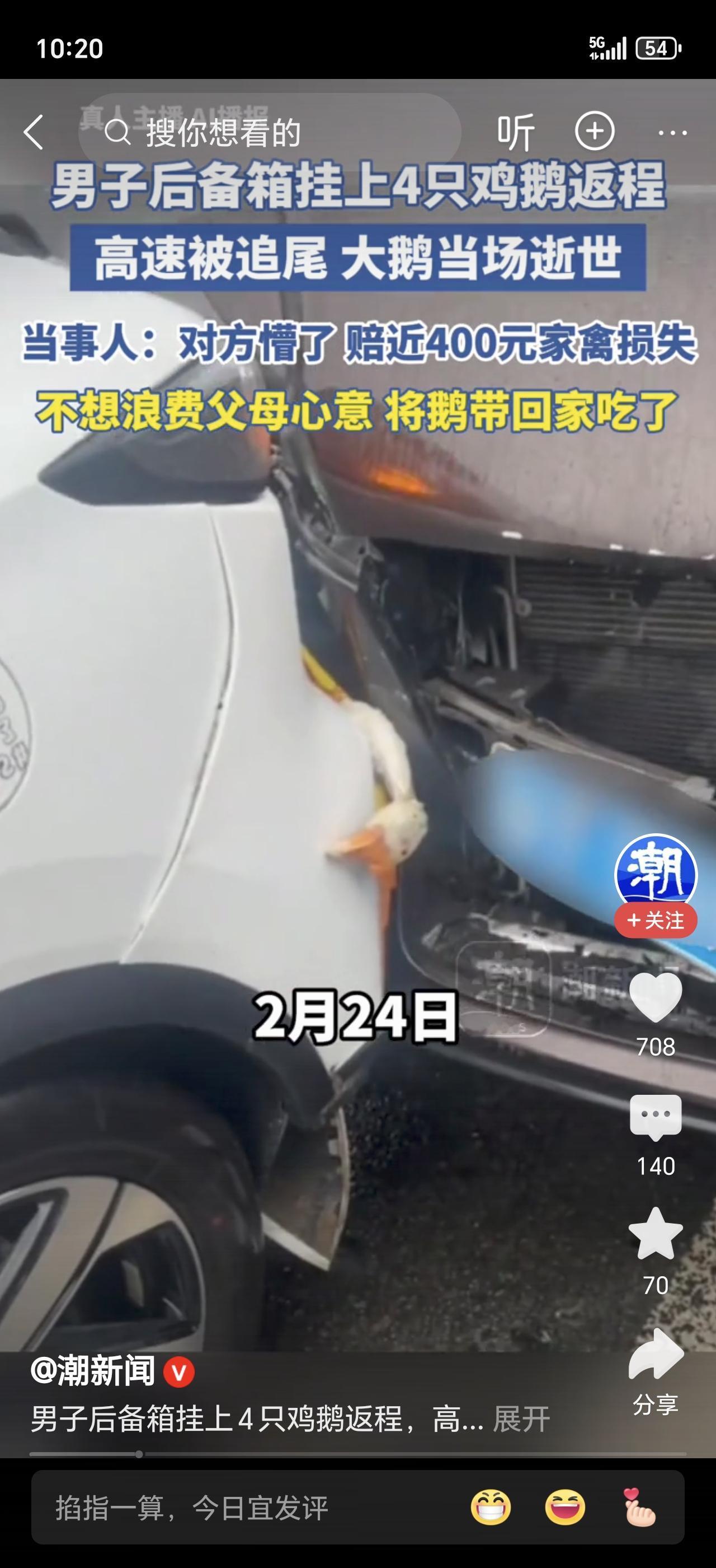 返程路上的“移动年货”出大事了!湖北一男子把老家带的4只鸡鹅挂后备箱外,结果被追尾,鸡飞鹅死,现场画面太扎心! 事情发生在2月24日,湖南永州。湖北襄阳的胡先生开车回广东上班,临行前父母给他塞了4只自家养的鸡和鹅,满满都是爱。他担心放车里会闷死,灵机一动——干脆挂后备箱外面! 结果开着开着,前方急刹,后车没反应过来,“砰”一声怼了上来。胡先生下车一看,心都凉了半截——两只鸡当场撞烂,两只鹅也全死了,其中一只正好夹在两车之间,死状惨烈。 最绝的是后车车主,下来后盯着那只夹扁的鹅,静静地看了半天,估计也在思考“这算不算财产损失”。胡先生说,对方配合报了保险,赔了三四百元家禽损失。 事情还没完。胡先生看着一地鸡毛,实在不忍心浪费父母的心意,把还能要的那只鹅带回家,洗洗下锅吃了。他感叹:“本想吃到新鲜土货,没想到是这种结局。” 事后他给父母打电话,老人家第一句话不是问鸡鹅,而是:“人没事吧?” 网友神评论:“大鹅想过无数种死法,唯独没算到这一种”“保险公司:赔车赔人,但没赔过活禽啊”。也有交警提醒:车外悬挂活禽属违法行为,一旦脱落引发事故,车主得担责! 如果你是胡先生,明年还敢这样带年货吗?后备箱挂鸡鹅这种操作,你见过没?评论区聊聊~广西撞死四鸡 高速路扔年货 收鹅车 广西撞死只鸡
