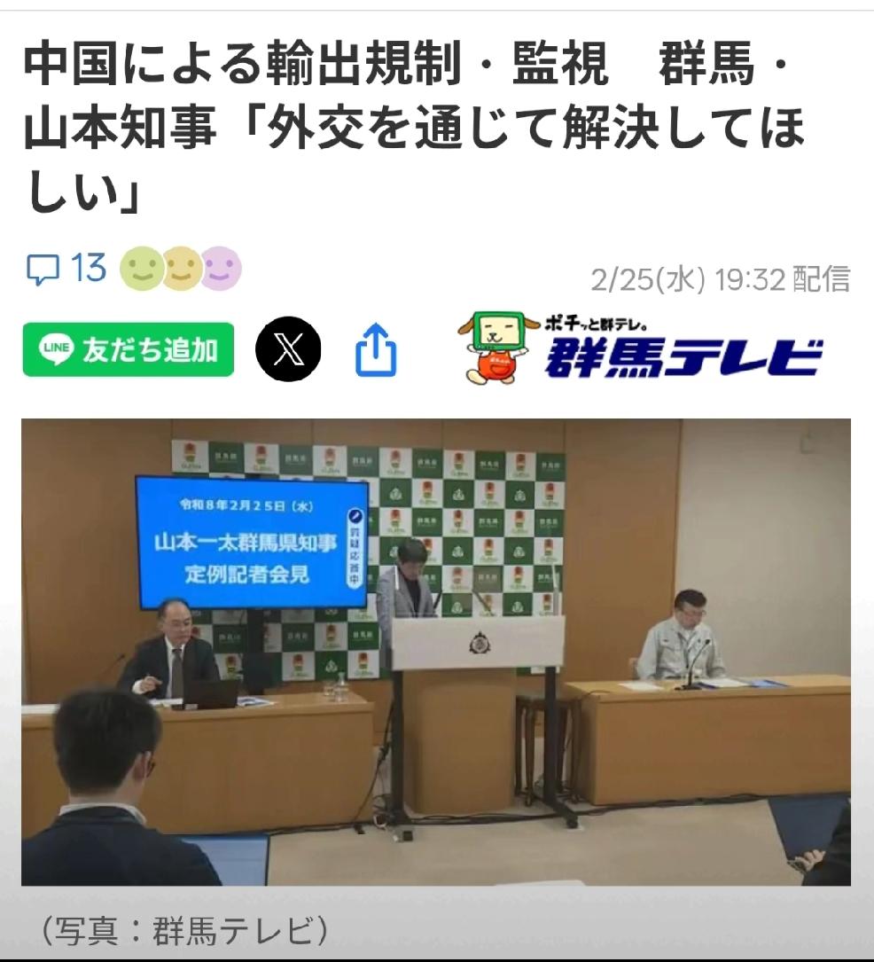 2月25日,日媒报道,群马县知事记者会上向高市施压。 日本群马县山本一太知事于25日记者发布会上,要求高市首相迅速“通过外交解决此事”。 总部位于群马县富冈市的IHI航天和在大田市设有工厂的斯巴鲁,被列入出口管制和监管名单,25日的线知识记者会,群马县产业经济板野部长表示,群马县内包括IHI航天和斯巴鲁在内的六家相关企业受到影响,这六家公司,又牵连许多中小企业合作伙伴。 个人认为:个人愿意看到这种内部互相冲突情况。 有人在为受影响的日企,发言争夺利益。 有人在为自己的党派,如何利用这种影响给自己一方牟利而奔波发言。 这几天事件正在日本内部发酵,已造成冲突,不过还无法形成规模性的反应,有待进一步的互相冲突。 削弱日本就是为了防止战争,追求和平,保卫家园。