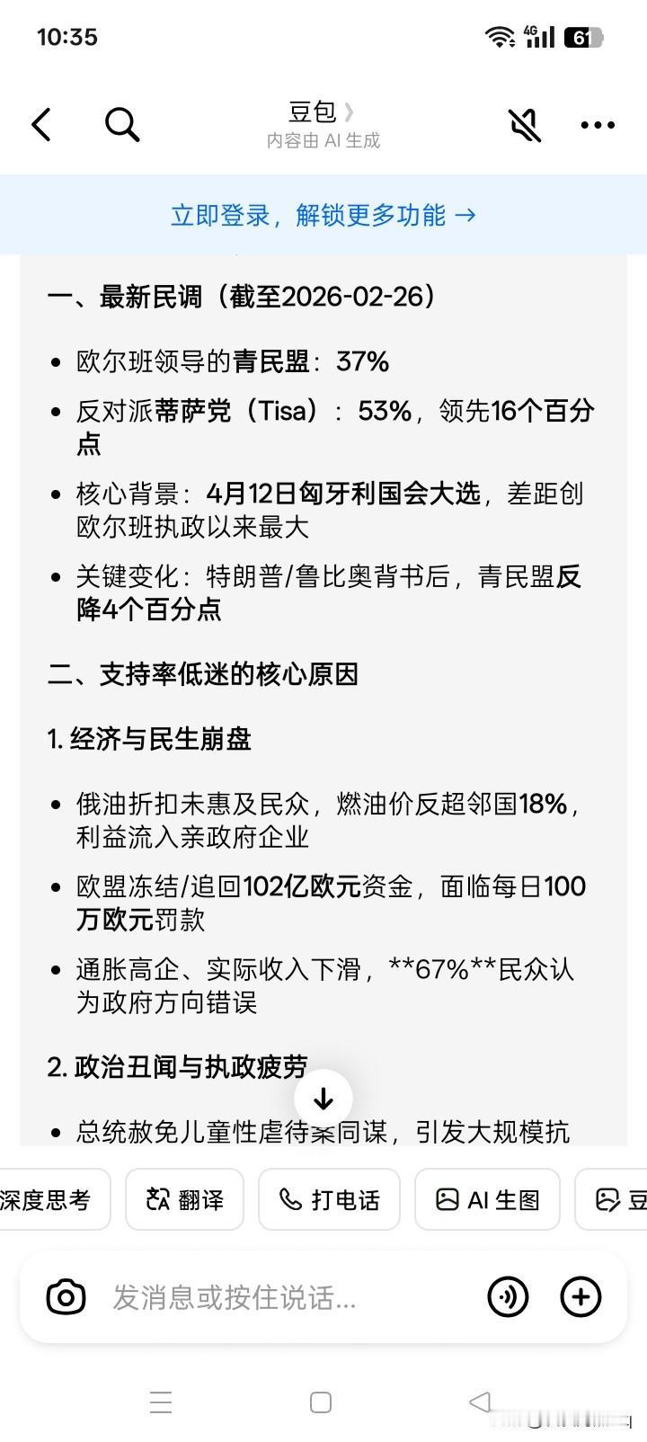 穷途末路吗? 匈牙利总理欧尔班领导的匈牙利执政党青民盟支持率,在四月份将举行的大选的民调中,远远低于反对党领导人马扎尔领导的“尊重与自由党”。 虽然欧尔班得到了美国总统特朗普和国务卿卢比奥的公开大力支持,但据有消息说,欧尔班的青民盟的支持率,不仅没有上升,反而下降了4个百分点。最新的民调结果显示,青民盟的支持率已经下降到37%,而“尊重与自由党”的支持率上升到53%。 与此同时,欧尔班好像耸人听闻的什么:“投错票,儿子送乌克兰前线”,以及乌克兰才是匈牙利的威胁的警告,似乎也没有起到什么作用,很可能反让匈牙利选民反感。 其实,欧尔班作为匈牙利的国家领导人,好像已经太久了,大概需要挪挪位置。 流水不腐,户枢不蠹嘛。