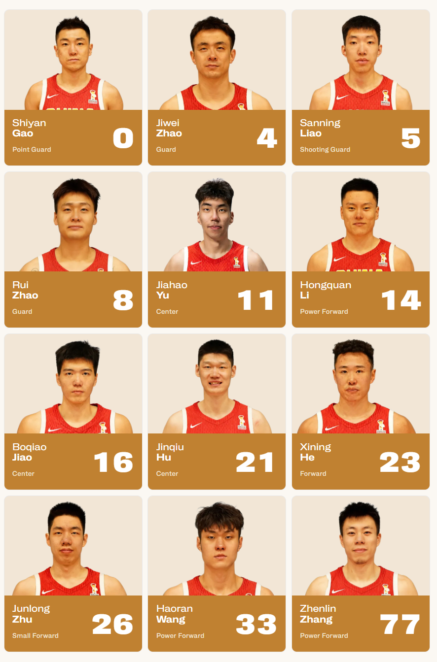 中国男篮名单:赵睿、廖三宁、赵继伟、张镇麟、李弘权、胡金秋、朱俊龙、高诗岩、贺希宁、余嘉豪 、焦泊乔、王浩然。