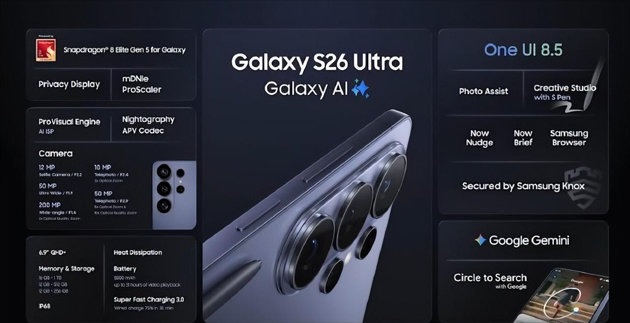 5000毫安时的安卓机皇来了![笑哭]三星 S26 Ultra 正式发布,9999 元起,顶配 1TB 仅 13999 元 2026 安卓旗舰天花板正式降临?搭载第五代骁龙 8 至尊版 for Galaxy定制芯片、硬件级防窥屏、全焦段四摄、超薄机身。[灵光一闪] 正面搭载 6.9 英寸 2K 120Hz OLED 直屏,自带防窥黑科技,公共场合用机再也不怕隐私泄露;定制骁龙芯加持,性能直接拉满,游戏、剪辑、多任务全开无压力。影像系统堪称 “口袋专业相机”,200MP 主摄 OIS 加持(加大光圈),50MP 超广角 + 3x 长焦(降级) + 5x 潜望长焦(加大光圈)。 续航配备 5000mAh 大电池,60W 有线 + 25W 无线快充,告别电量焦虑;S Pen、IP68、超声波指纹、双扬声器、UWB、eSIM 等旗舰配置全部拉满,商务娱乐全能通吃。更惊喜的是 7.9mm 超薄机身 + 214g 轻盈重量,兼顾质感与手感,幽夜紫、旷宇黑等 6 款潮流配色。 售价方面,12+256GB 版 9999 元,12+512GB 首发价 10799 元,16+1TB 顶配首发仅 13199 元[奸笑]怎么样?你们觉得如何?