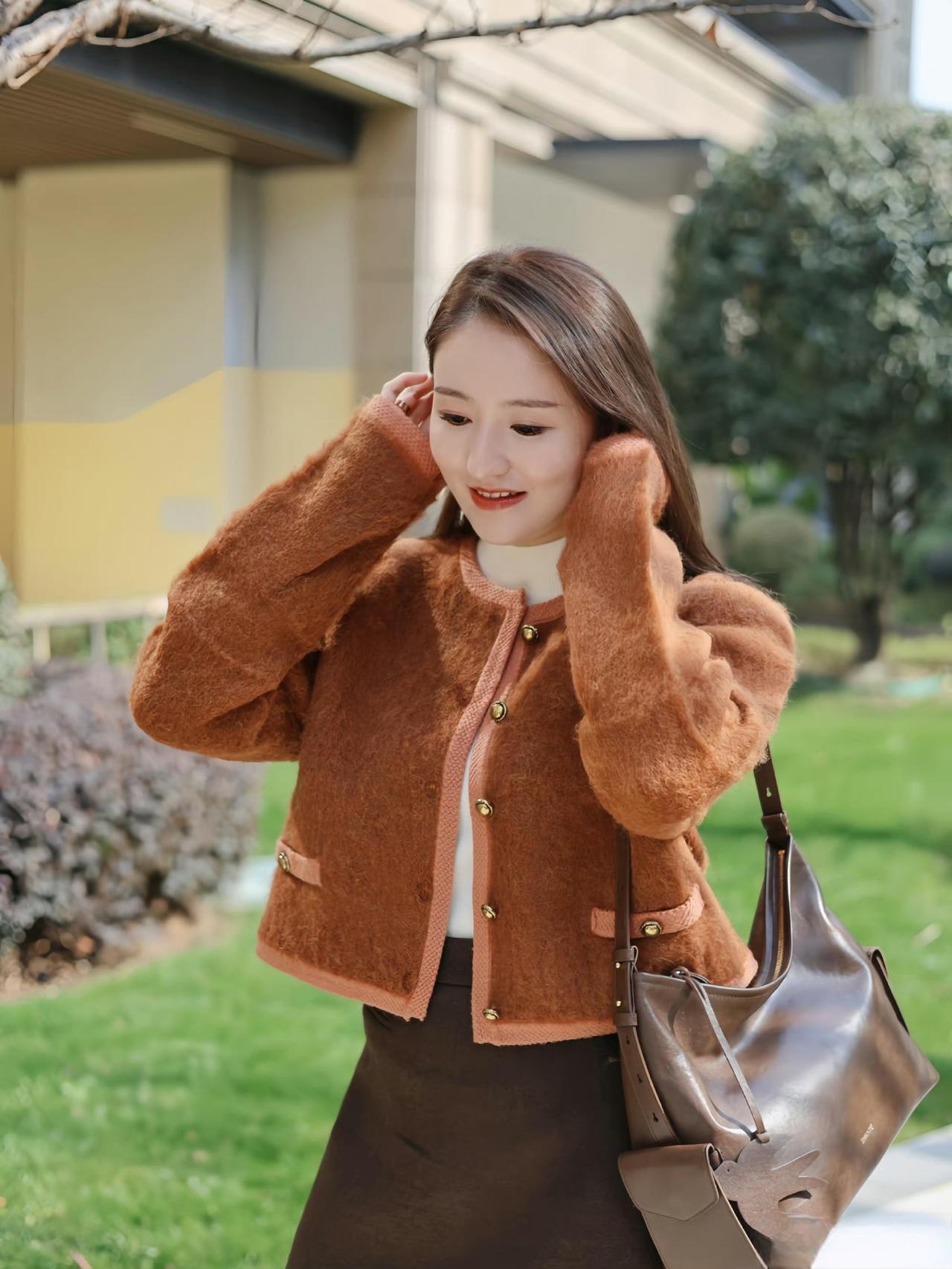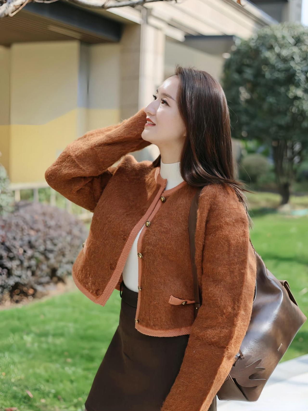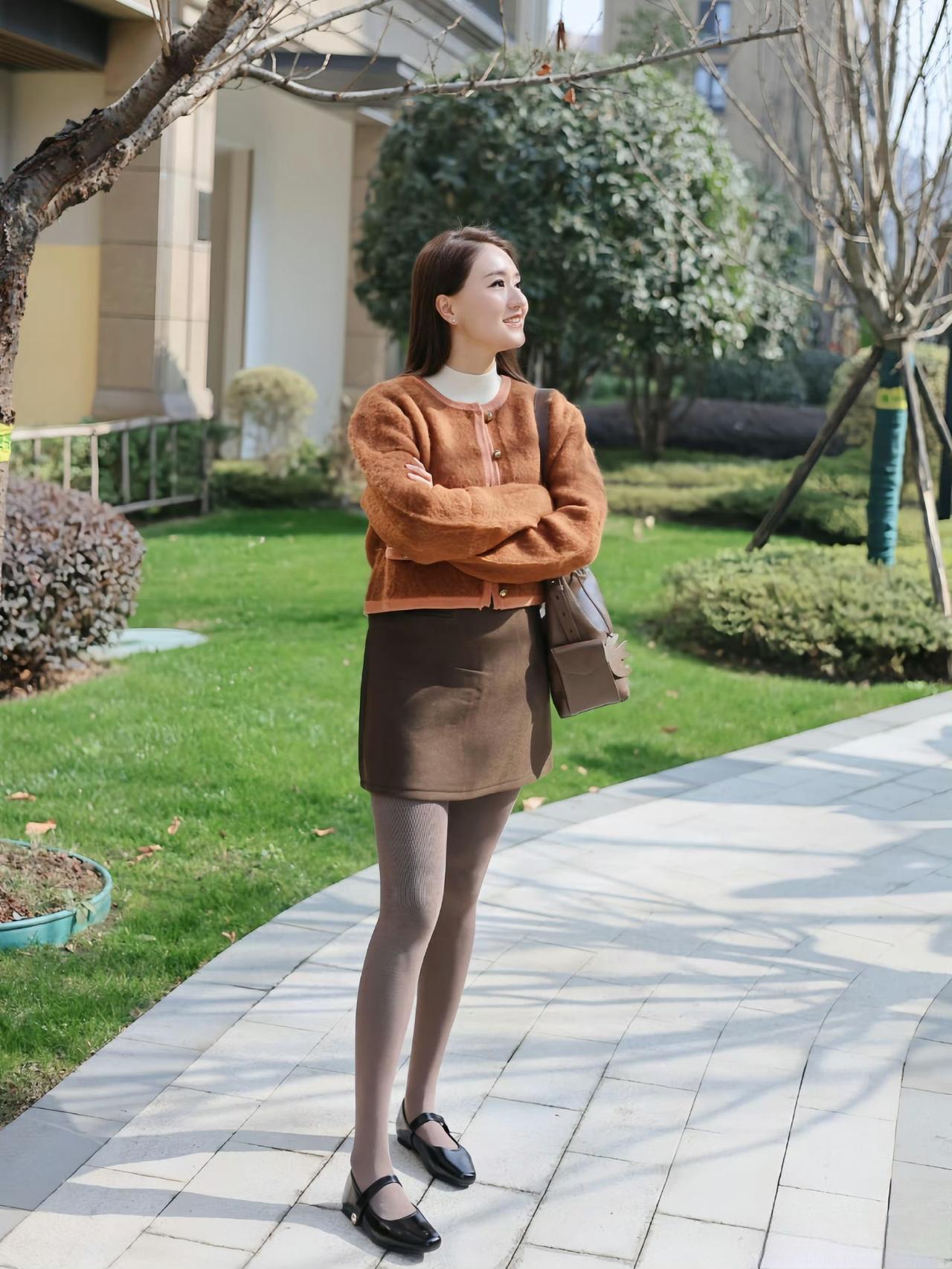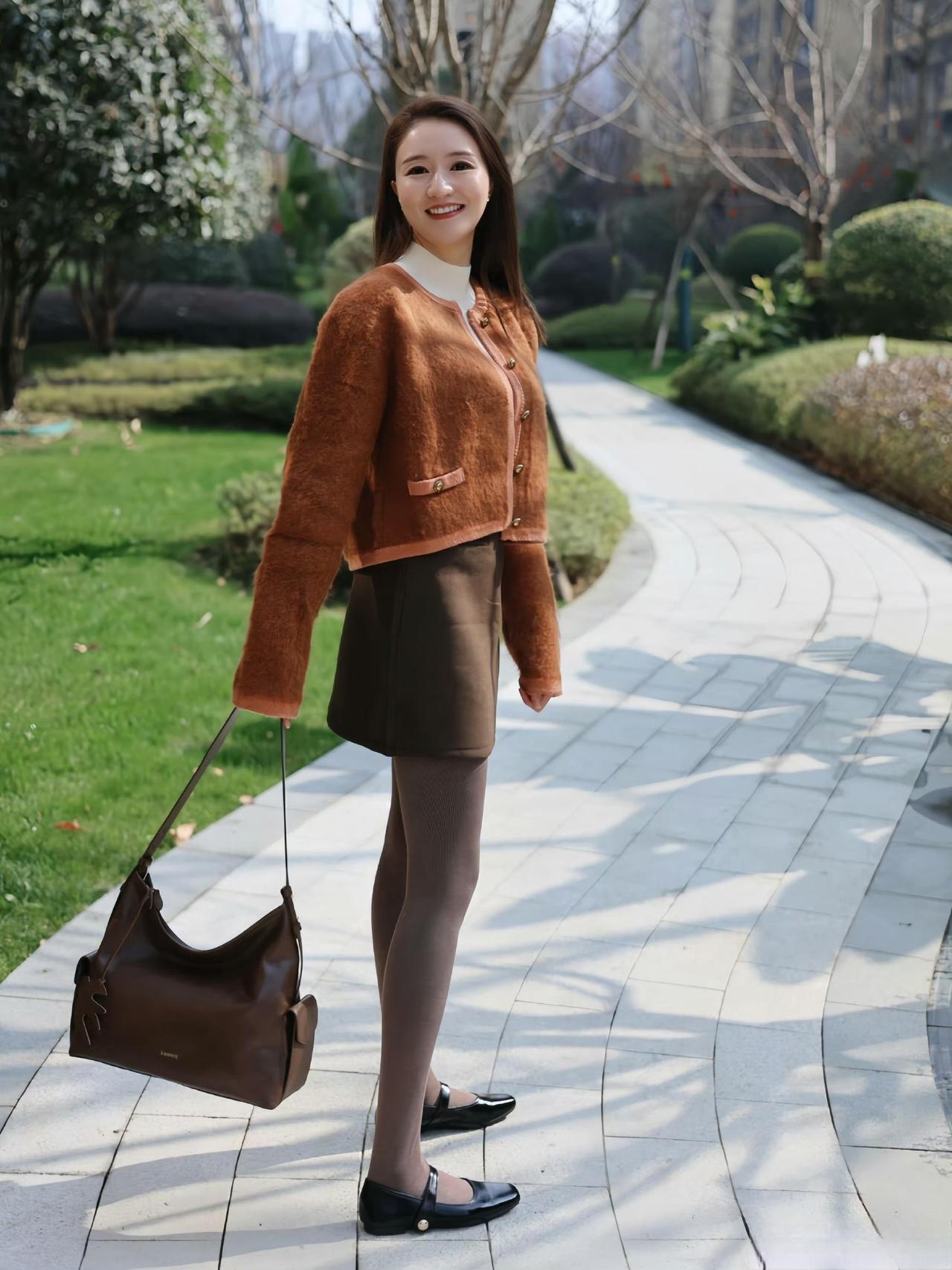 这套是温柔暖棕风,核心是焦糖棕毛绒短外套+深棕半裙的同色系搭配:毛绒材质自带温暖松弛感,撞色包边和金属扣增加了精致贵气感,内搭白色高领打底提亮了整体,同色系半裙+浅棕袜子延续了柔和氛围,搭配黑色玛丽珍鞋和棕调包包,整体色调和谐又显气质。焦糖棕穿搭 焦糖棕毛绒外套
