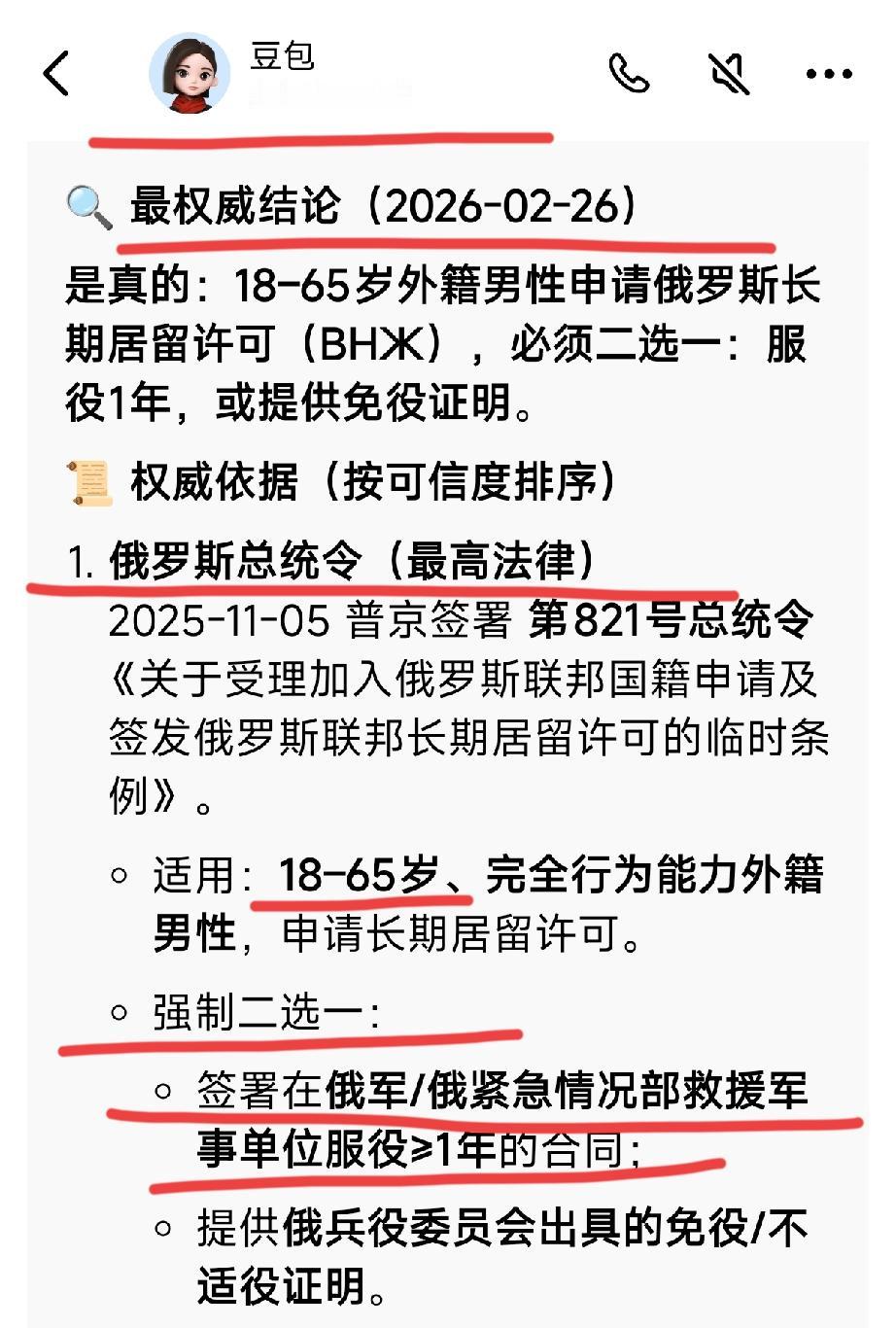 转载权威信息: 18-65岁外籍男性申请俄长期居留许可,必须强制服兵役一年。 俄