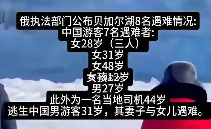 贝加尔湖8名遇难者,施救画面曝光,令人遗憾。名单公布,其中有7名中国游客。女,28岁三人,女,31岁,一人,女,48岁,一人,女孩12岁一人,男,27岁一人。 有一名当地人,是司机,男,44岁。 一人逃生,男,31岁。他的妻子和女儿遇难。
