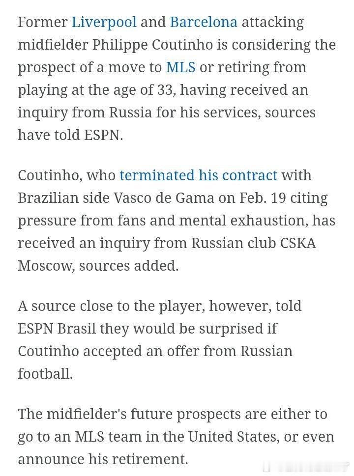 ESPN透露库蒂尼奥正在考虑转会美国职业足球大联盟或在33岁时退役,当然他收到了来自俄罗斯的报价询问。(个人认为ESPN的可信度很低)