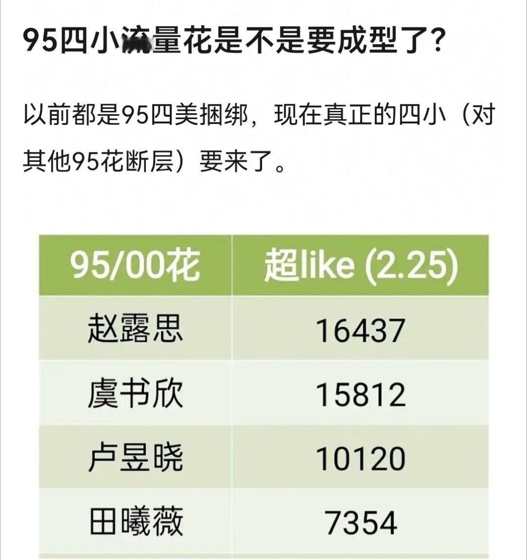 95流量小花格局变了,卢昱晓赶超田曦薇成为第三。