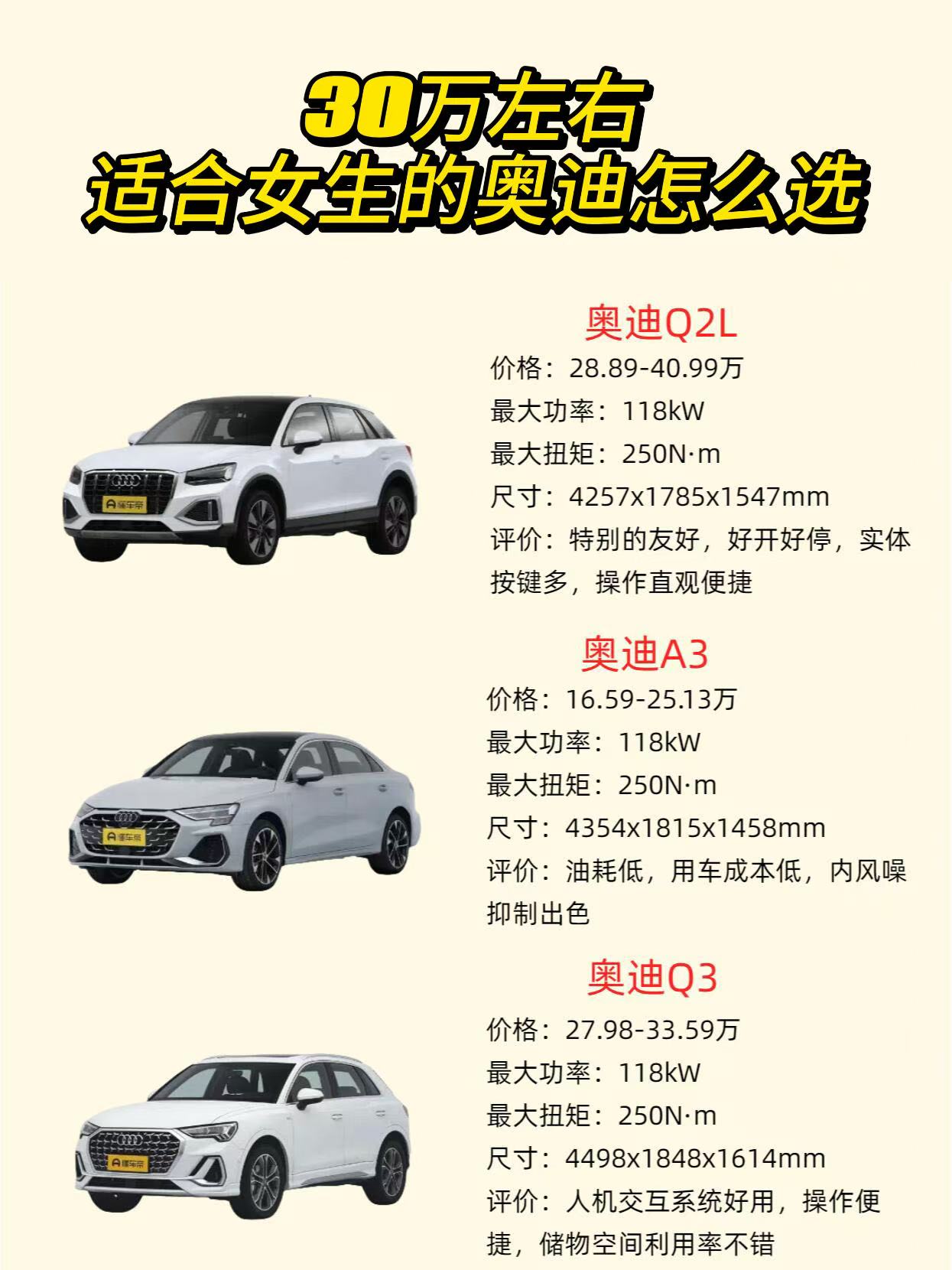 最后,一句话帮你拍板 · 奥迪Q2L:属于宝妈+新手党,15万落地奥迪+好开好停+低养车成本,建议中配版,但对内饰塑料和后排空间放低期待。 · 奥迪A3:属于年轻人+运动控,13万裸车+1.5T+30色氛围灯+9气囊,建议两厢版,但对高速隔音和车机卡顿有心理准备。 · 奥迪Q3:属于品质控+四驱党,NVH升级+2.0T高功率+quattro四驱,建议2.0T版,但对后排空间和预算有预期。