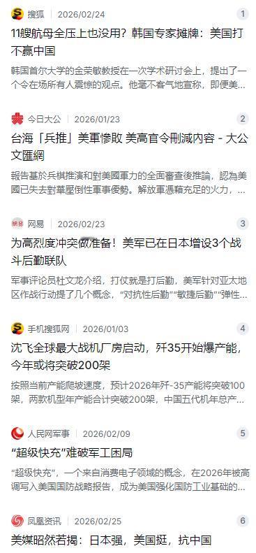 韩国军事专家再次语出惊人:只要中美战争爆发,那么美国就算拿出自己全部的家底,美国的结果只有一个,那就是失败 麻烦看官老爷们右上角点击一下“关注”,既方便您进行讨论和分享,又能给您带来不一样的参与感,感谢您的支持! 韩国首尔大学的一位军事专家金荣敏教授,在一次学术交流会上抛出了一个挺震撼的观点。他说,别看美国现在在亚太地区咋呼得欢,要是真和中国爆发大规模冲突,就算把全部家底——那11艘航母战斗群都押上,最后的结果也只有一个,那就是输。这话听起来有点耸人听闻,但他可不是一拍脑袋就瞎说的,而是扎扎实实从地理、后勤、工业这些硬核角度掰扯了一遍,还真让人没法反驳。 金荣敏首先点出了一个最实在的问题:打仗就是打后勤,而美国在亚太最大的软肋就是离得太远。你想,如果冲突在咱们家门口爆发,中国的兵力、装备、补给,顺着公路铁路就送上来了,军舰受了伤,拖进附近的船厂几天就能修好。可美军呢?所有吃的用的,都得从几千公里外的珍珠港或者本土运过来。那些慢吞吞的运输船,在茫茫大海上简直就是活靶子。美国国防部自己2025年搞的兵棋推演也承认,这补给线一旦被切断,前线的航母就成了挨打的铁棺材,根本玩不转。 除了地理上的劣势,金荣敏还特别强调了工业能力的差距。现代战争打起来,导弹炮弹就跟烧钱似的,消耗得飞快。这时候拼的就是谁能造得又快又多。咱们中国是全球工业门类最全的国家,真到了关键时刻,工厂一开足马力,装备就能源源不断地下线。反观美国,这些年工业空心化太厉害,造个军舰又贵又慢,好多零件还得从国外买。军事专家张延廷也吐槽过,美国现在修一艘核潜艇得好几年,F-35战机也老是出毛病,这产能和效率,跟二战那会儿"世界兵工厂"的派头比,简直是天壤之别。一旦弹药打光了,后方补不上来,这仗还怎么打? 再说说盟友这回事。美国一直想在亚太拉帮结伙对付中国,但金荣敏教授觉得这些盟友心里都有小算盘,根本靠不住。他拿自己国家韩国举例,中韩一年的贸易额那么大,尤其是半导体和汽车,要是为了美国把最大的生意伙伴给得罪了,这不是傻吗?日本也一样,虽然跟美国走得近,但它造导弹、造雷达用的稀土,几乎全得从中国买,真翻了脸,经济立马就得停摆。至于菲律宾、越南这些国家,跟咱们合作搞开发、做买卖赚得盆满钵满,谁愿意去给美国当挡子弹的炮灰?大家心里都明白,安安稳稳搞发展才是正道。 最让金荣敏看重的,其实是一个国家在危难时刻的凝聚力。他说,中国现在的国防建设,不是要出去侵略谁,而是要把家门口的篱笆扎得严严实实的。从能打几千公里的东风导弹,到隐身能力超强的歼-20战机,再到被称为"关岛快递"的东风-26,这一整套"反介入/区域拒止"体系,早就织成了一张密不透风的网。任何一个国家的军队要撞进这张网里,都得好好掂量掂量。而且,咱们十四亿人那种同仇敌忾的劲儿,那种一旦有事就能迅速动员起来的力量,美国那种利益至上的社会根本没法比。 有意思的是,金荣敏这个看上去挺大胆的判断,跟美国自家智库的推演结果竟然对上了。去年底美国传统基金会搞了好几千次台海冲突的兵棋模拟,结论非常扎心:美军在冲突爆发后几周内就会打到"崩溃点",在西太平洋会遭受"灾难性损失"。这个报告本来是要给高层看的,但据说因为内容太敏感,里面好多细节在发布前都被要求删掉了,生怕把美军的底裤给露出去。这也从侧面说明,美国的军事优势真不像它嘴上说的那么硬气。 说白了,金荣敏教授的这番话,就像把窗户纸给捅破了。美国的军事霸权看起来很唬人,但在亚太这个特定的棋盘上,面对一个有完整工业体系、有强大凝聚力、又在家门口作战的对手,它的那些优势全都被拿捏得死死的。战争不是请客吃饭,比的是谁的家底厚、谁的板凳深、谁的后路稳。在这些实打实的东西面前,光靠几句狠话和几条航母,已经吓唬不住人了。