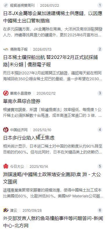 日本人为什么不怕中国制裁?甚至连稀土制裁都不怕?说白了,因为日本早就做好了两手准备! 麻烦看官老爷们右上角点击一下“关注”,既方便您进行讨论和分享,又能给您带来不一样的参与感,感谢您的支持! 2010年秋天,中日因为钓鱼岛撞船事件关系跌入冰点。虽然官方层面没明说,但当年事实上对日的稀土出口收紧,直接让日本的芯片、汽车、军工产业感受到了切肤之痛 。那时候日本才突然惊醒,原来自己高端制造的命根子一直被捏在别人手里。自那以后,日本政府和产业界就像患上“稀土焦虑症”,狠下心来搞了一场持续十几年的国家战略,目的只有一个:摆脱对中国稀土的依赖。 日本人执行力很强,第一手准备就是在全球疯狂找矿。在此后十余年里,以JX金属、丰田通商、住友商事为代表的日本财团,拿着真金白银跑遍了澳大利亚、东南亚、非洲甚至美洲 。他们的计划很完美,要在这些地方开矿建厂,搞一套完全独立于中国的稀土供应链。然而理想很丰满,现实很骨感,海外找矿不是有钱就能搞定的,要么碰到当地政策突变,要么被环保组织告到停工,折腾了十几年,大多数项目要么停滞不前,要么算下来成本高得吓人,根本没法开工。 海外碰了一鼻子灰,日本政府赶紧启动“第二手准备”,把目光收回到国内。一边推出大额补贴,鼓励信越化学这类企业把废旧家电和新干线上淘汰下来的旧磁铁回收起来,从这些所谓的“城市矿产”里提炼稀土 。另一边,日本盯上了位于东京东南约1900公里的南鸟岛,那里深海6000米的海底发现了高浓度的稀土泥 。这听着确实诱人,可现实却给了日本两记响亮的耳光。回收这边,废旧马达就那么点,拆一堆还不够塞牙缝,纯度也达不到造精密仪器的要求 。深海开采更别提了,6000米的深度,技术难度大到没边,算下来的成本比从中国直接买要贵将近20倍,完全没法商业化。 折腾了十几年,投入了上千亿日元,结果怎么样呢?咱们得看硬指标。根据权威统计,到了2025年,日本高端制造业死活离不开的镝、铽这些重稀土,至今几乎仍然是100%要从中国进口 。像丰田旗下的Proterial公司,虽然研发出了不用重稀土的磁铁,但那也是实验室里的产物,大规模量产还远着呢 。日本其实败得不冤,他们以为有钱就能复制一切,但中国手里攥着的不仅是矿,更是从上世纪八九十年代就一代代积累下来的完整产业链和独门绝技。 说白了,日本这十几年走过的弯路,反而验证了中国稀土地位的不可撼动。咱们这边能把稀土提纯到99.99%甚至更高,成本还比国外低60%到80%,这种硬功夫,不是靠砸钱或者政客喊几句口号就能速成的 。如今的情况就是,不管你日本做了多少手准备,想造电动车、造F-35战机,最后的关键材料还是得看中国的脸色 。这已经不是简单的买卖问题,而是靠几十年工业沉淀堆起来的绝对壁垒。