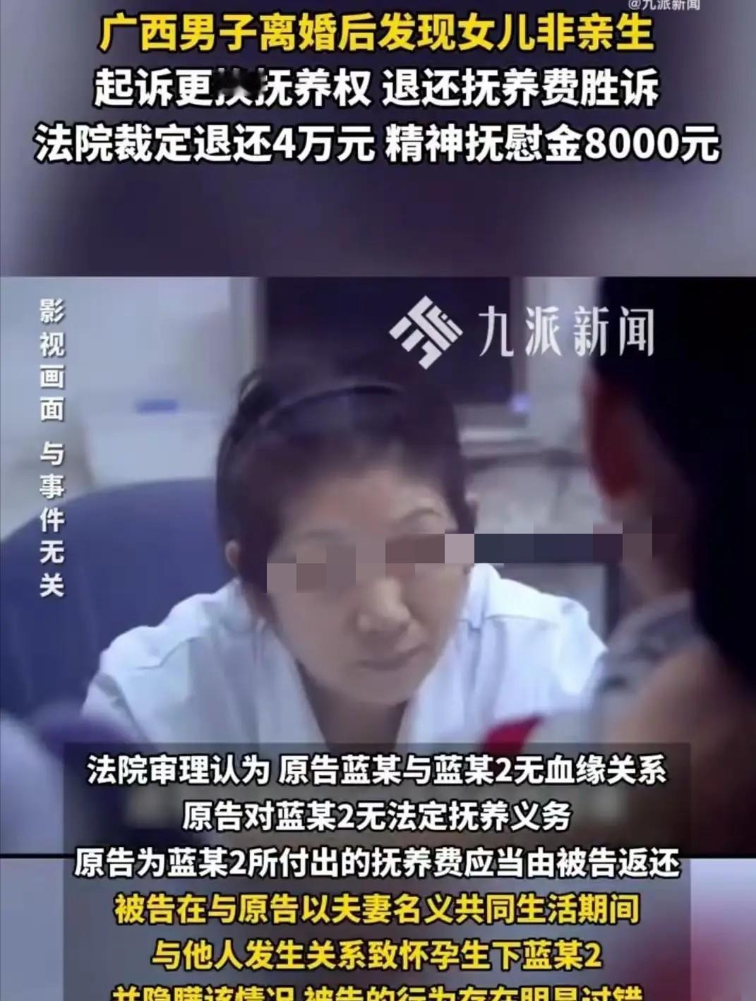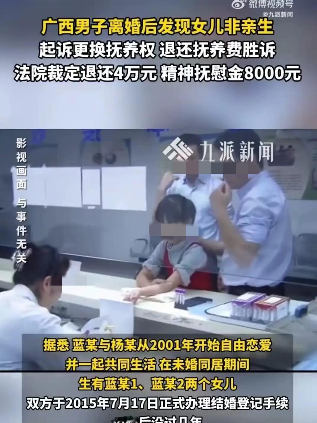 “天都塌了!”广西贵港,一男子离婚,二女儿归他,大女儿归妻子,可男子发现,二女儿越长越不像自己,男子忍不住做了亲子鉴定,结果显示,他不是二女儿的亲生父亲,女儿是妻子和别人生的孩子,男子越想越气,将前妻告到法院,要求变更抚养权并退还抚养费,还要前妻赔偿他精神损失费。 2026年2月中旬,贵港市金桂司法鉴定中心的大厅里,消毒水的味道呛得人直皱眉。蓝某死死攥着那份鉴定意见书,手指关节都泛了白,白纸黑字六个大字像刀子一样扎进眼睛:排除亲生血缘关系。 他双腿一软,当场瘫坐在冰冷的长椅上,脑子里反复过着邻居那些欲言又止的眼神,憋了半天,对着空气低吼了一声:"天都塌了!" 这个在贵港港北区开了多年五金店的汉子,怎么也想不到,自己拼了命挣下的家底和五年的心血,到头来竟是个笑话。 说实话,蓝某这人老实本分,跟前妻杨某的交集能追溯到2001年。那时候两人都没领证就住到了一起,日子过得紧巴巴但有盼头。大女儿降生时,他满心欢喜,特意给孩子取名“蓝杨”,将夫妻俩的姓氏合二为一,藏进孩子的名字里。 这简单的组合,藏着最真挚的心意,也是那段时光里,两人感情最温暖的见证。2015年7月17日登记结婚那天,蓝某满心踏实安稳。家中儿女双全,店里生意蒸蒸日上,在他看来,这样安稳红火的日子,只会越过越好,怎么也不会走到差的地步。 可日子久了,柴米油盐的琐碎争执把耐性磨成了粉末。2021年,两人的婚姻彻底散伙,当时做了个约定:大女儿随妈,年仅3岁的二女儿蓝兰随爹,蓝某硬气地没要一分抚养费。 这五年里,蓝某既当爹又当娘,那日子过得叫一个苦。每天清晨五金店还没开门,他得先张罗孩子的早餐,煮粥、煎蛋、送上学,一样都不能落。为了给蓝兰攒学费、买新衣服,他在店里起早贪黑,一件旧褂子穿了好几年都舍不得换,袖口都磨出了毛边。 法院后来统计过,这五年他陆陆续续在孩子身上砸了17万,那是他在货架、螺丝、钳子堆里一颗颗攒出来的辛苦钱,每一分都带着汗味。 结果呢?孩子越长越开,那模样跟他半点关系没有。眉眼、鼻梁、脸型,怎么看怎么不对劲。这种疑虑像野草一样在心里疯长,白天守着店心不在焉,晚上看着熟睡的孩子直发愣。 邻里间的闲言碎语,他并非没有察觉,只是不愿往心里去,更不敢细细琢磨那些藏在话里的意味,只能装作若无其事,把那些细碎的议论轻轻放在一边。 终于,在2026年这个初春,他瞒着所有人带孩子去了鉴定中心。那天他在门口徘徊了整整二十分钟,抽了半包烟才鼓起勇气进去。这一查,直接把过去五年的生活彻底掀翻。 这种被法律界定为"欺诈性抚养"的打击,不仅是钱的问题,更是自尊被按在地上摩擦。杨某在婚姻存续期间的刻意隐瞒,直接导致蓝某在毫无法律义务的情况下,为一个毫无血缘的孩子付出了高昂的物质与情感成本。说白了,这五年他当的是冤大头,养的是别人的种。 蓝某没打算忍,直接把话撂在了法庭上:孩子还给你,钱你得退我,我的精神损失你得赔! 贵港市港北区人民法院的判决逻辑很清晰:杨某这种隐瞒真相的行为,不仅是欺骗,更是对蓝某人格尊严和财产权的侵权。根据《民法典》的原则,这种不该由蓝某承担的抚养开支属于杨某的"不当得利",这钱必须得退。 2026年2月下旬,判决书下来了。法院考虑到当地生活水平和杨某的过错程度,判令杨某返还抚养费4万元,并支付8000元的精神损害赔偿金。 看看这个数字,再看看蓝某那本5年累计支出17万的账簿,悬殊得令人心惊。从法律尺度看,这是一种权益的回归与平衡。 但从人情冷暖看,那一千八百个日日夜夜里产生的父女情分,根本没法量化。那些半夜起来给孩子盖被子的夜晚,那些省吃俭用只为给她买条新裙子的日子,那些手把手教她写字的黄昏,全都成了一场荒唐的独角戏。 这出闹剧在2026年初的贵港街头传开,留下一地鸡毛。法律确实可以退还那些冷冰冰的抚养费,却永远退不回蓝某在这段错位的父爱中,真实燃烧掉的五年光阴。 有人说他傻,早该查的。有人说他惨,摊上这种事谁都扛不住。但最扎心的是,那个叫他"爸爸"的小女孩,从头到尾什么都不知道。她只知道,那个每天给她做早餐、送她上学的男人,突然就不要她了。 参考信息:广西一男子离婚后发现小女儿非亲生,起诉前妻更换抚养权,退还抚养费!法院判了→ 2026-02-24 13:43·光明网