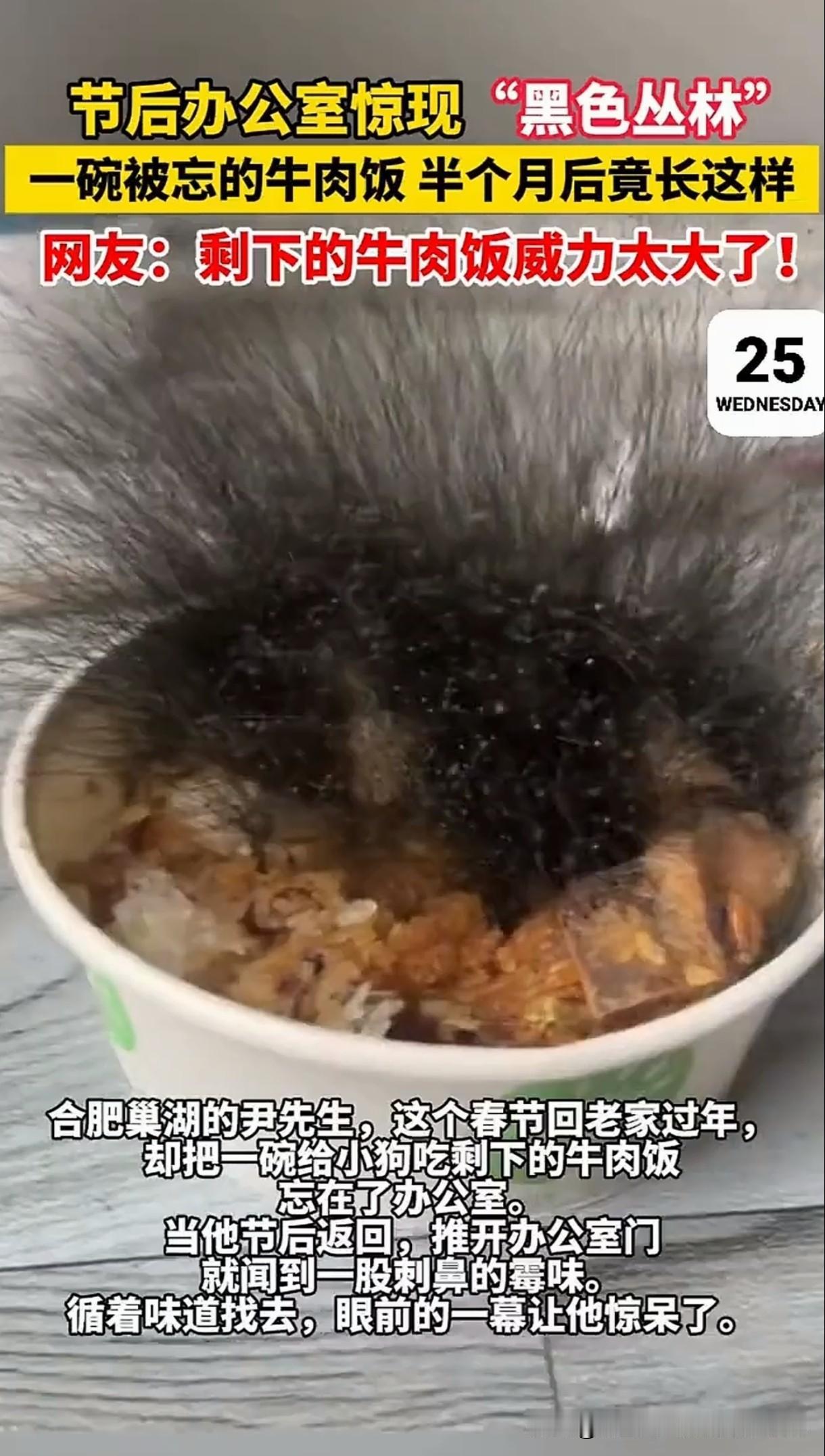 节后返工第一天的“惊喜”!合肥巢湖一兄弟,年前着急回老家过年,把一碗给狗子吃剩的牛肉饭,忘办公室了。好家伙,过年放了半个月,回来一推门,那味儿直接上头了!酸爽刺鼻,差点给送走。 循着味儿找过去一看,我的天!那碗饭已经彻底“黑化”了。碗口上密密麻麻,竖起来一片黑乎乎的“毛”,跟头发似的,据说有15公分高,简直是一碗微型的“黑色丛林”。这哪是牛肉饭啊,这分明是培育出了什么未知菌类文明! 主打一个无心插柳柳成“荫”,就是这“荫”有点吓人,是黑霉菌的荫。这玩意儿专家说了,很可能是什么黑曲霉之类的,产生的毒素对身体危害不小,可千万别好奇去闻去碰。 赶紧看看自己工位!有没有吃剩的水果、开封的零食、没洗的杯子?尤其是春节假期长的,赶紧清理!不然等你回来的,可能就是各种“奇幻森林”了。 这算不算掌握了“牛肉生发技术”的核心机密?实锤了,多吃牛肉,连霉菌都能长得如此茂密!😂 我宣布,这项专利成立了。 节后返工,收拾心情,也记得收拾工位。别让“惊喜”,变成“惊吓”啊朋友们!