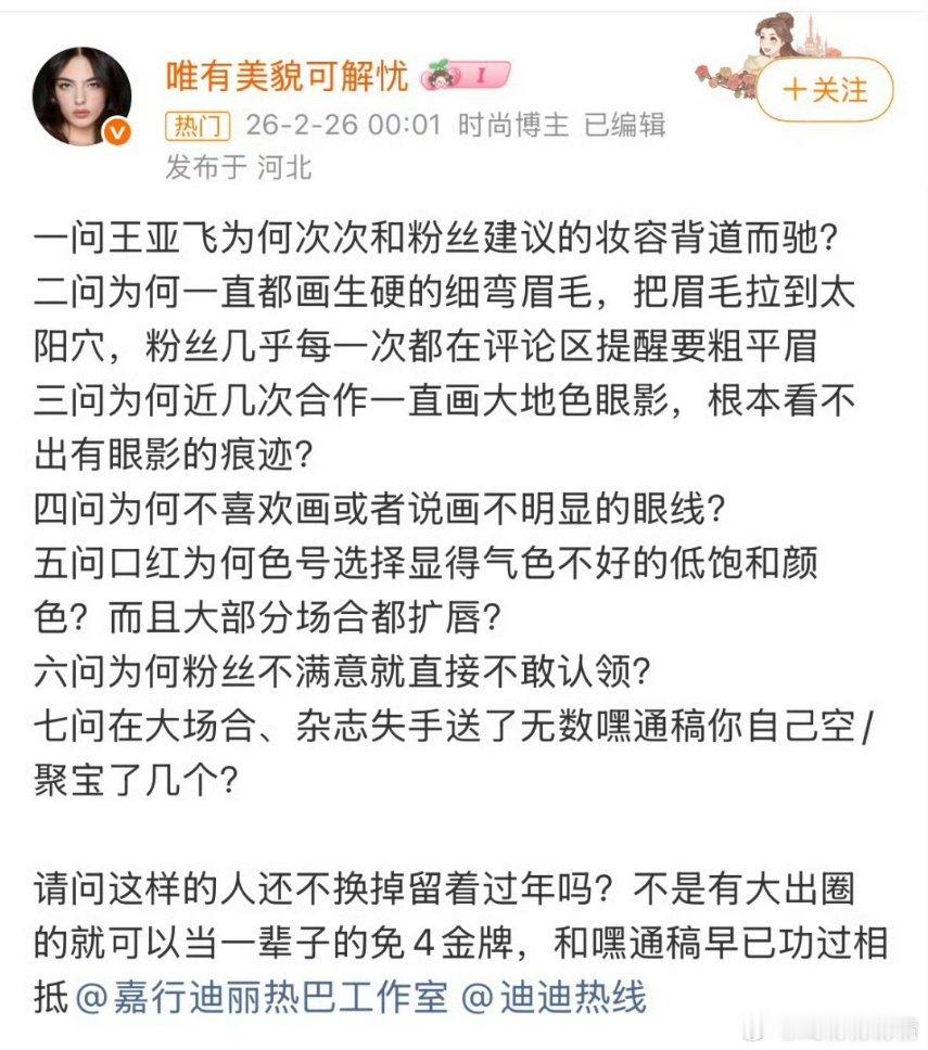 迪丽热巴粉丝七问王亚飞自从春晚一美惊人,热搜无敌爆谁给迪丽热巴化的妆 爱丽丝就恨王了,要求工作室换化妆师。那这个嫦娥奔月的妆容是谁化的?