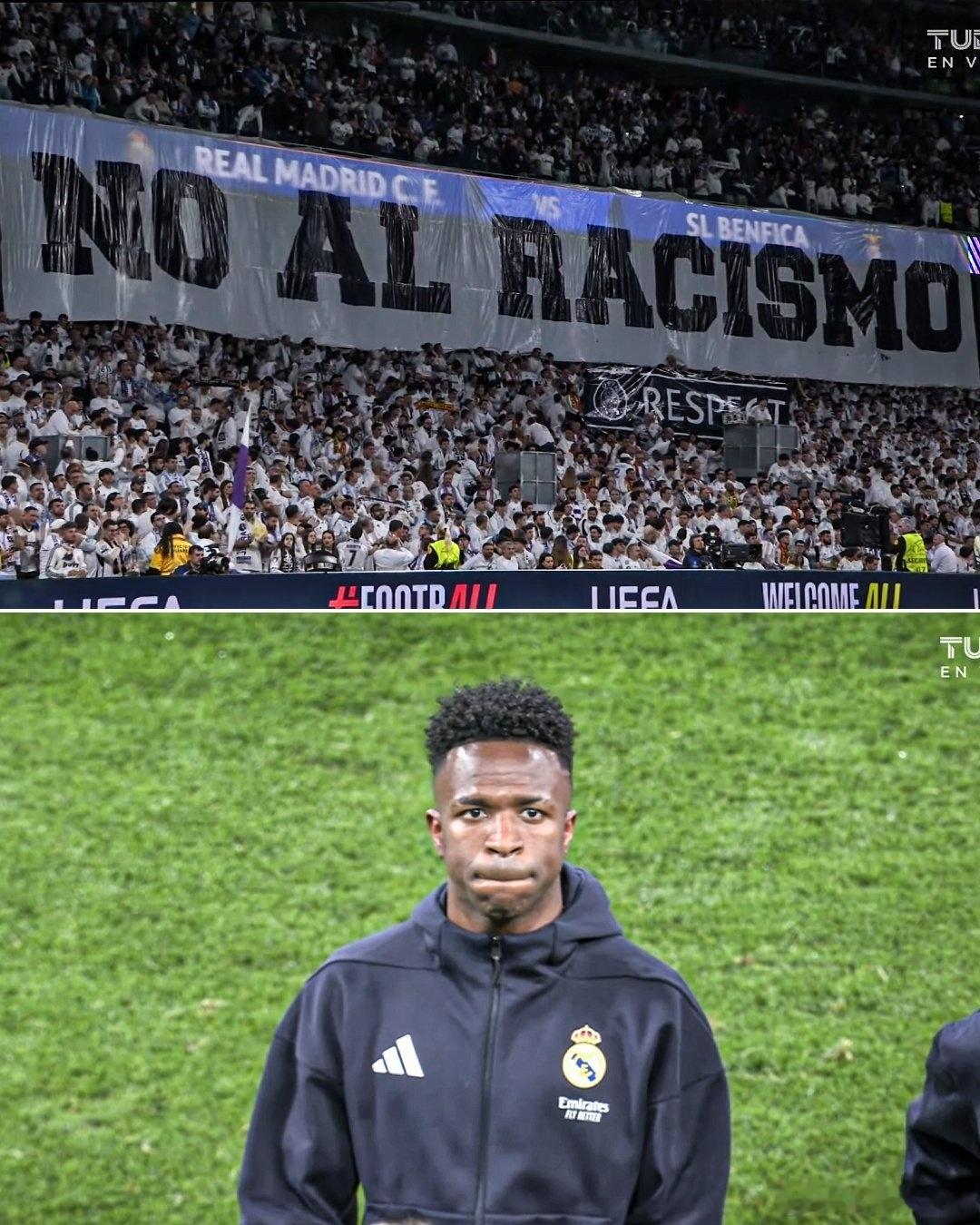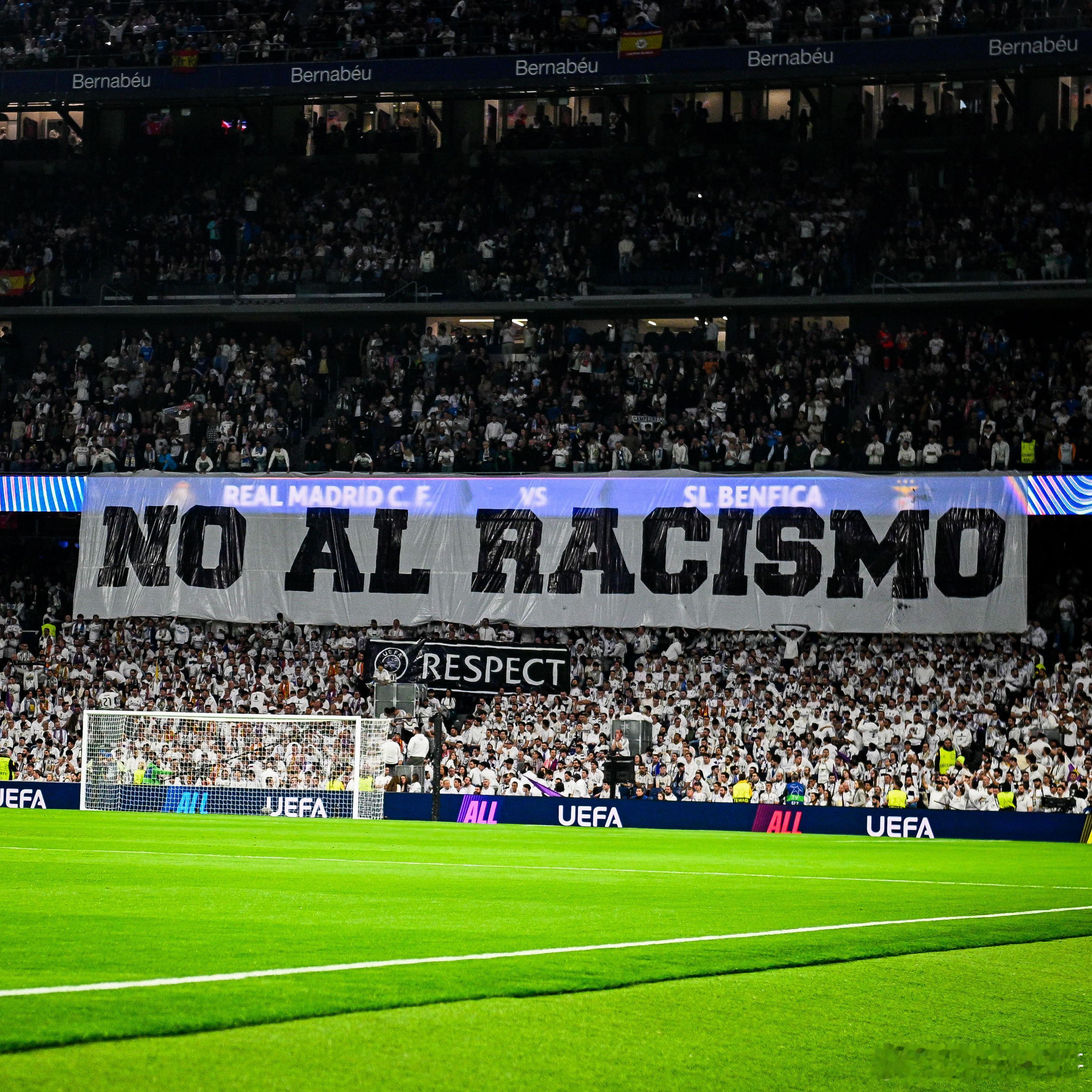 皇马球迷在对阵本菲卡的比赛中打出的横幅:“反对种族歧视”皇马2比1本菲卡欧冠16