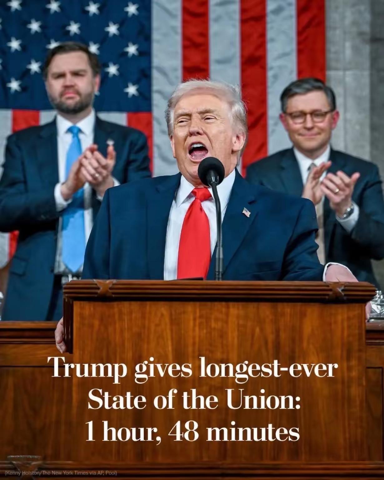 果然,不会吹做不了美国总统。看看特朗普那个吹劲,不服不行。当地时间2月24日晚,特朗普发表第二任期首次国情咨文,吹的下面人都脸红了。 特朗普宣称接手了一个“危机国家”,在他经营下,美国已经进入黄金时代:通胀大降、收入增长、股市上涨、房贷利率近四年最低。 吹嘘18万亿美元全球投资承诺,经美媒核实仅9.6万亿,夸大了近一倍。 关于最高法院判他的关税法案违法的事情,他说这个裁决令人失望,他将绕开国会,换个方式方式继续他的关税政策。 他称过去9个月“无非法移民入境”、驱逐约54万人,结束了8场战争。 整个发言时长近110分钟,创史上最长国情咨文,没有务实方案,只有浮夸吹嘘;没有团结姿态,只有对立煽动。特朗普用加工的数据、激进的民粹话术,试图营造繁荣假象,却掩盖不住美国经济乏力、社会分裂、国际信誉下滑的现实。 这场自说自话的表演,骗不了美国民众,更蒙不了世界。靠吹牛撑不起霸权,靠霸凌换不来尊重,美国的困境,绝非一场长篇演讲就能解决。