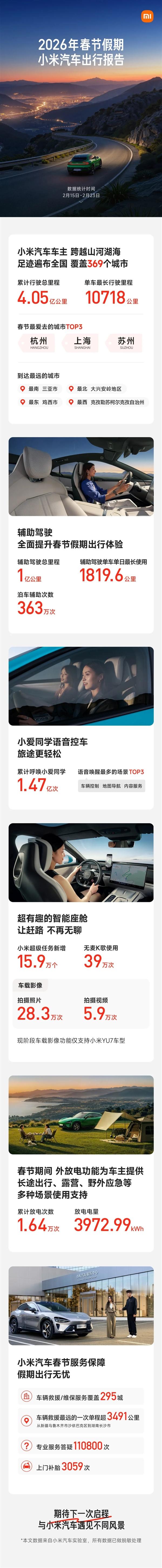 总里程:9天内车主累计行驶4.05亿公里,单车最高达10,718公里;覆盖广度:足迹遍及全国369城,最南至三亚,最北抵大兴安岭,最东到鸡西,最西达克孜勒苏;热门目的地:杭州、上海、苏州位列前三;智能驾驶:辅助驾驶总里程1亿公里,单车单日最高使用1819.6公里,泊车辅助363万次;智能座舱:小爱同学被唤醒1.47亿次,无麦K歌39万次,“超级任务”新增15.9万个;服务保障:完成专业答疑11万次,上门补胎3059次,最远救援单程3491公里(乌鲁木齐→长沙)。