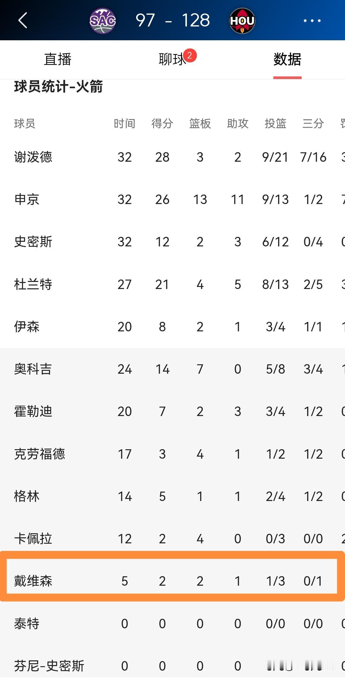 火箭小将戴维森真是太渴望得分了!在今天火箭主场以128:97击败国王的比赛中,戴维森终于再次获得了上场机会,他在替补出战的5分钟里,投篮3中1得到2分2篮板1助攻,没有出现失误和犯规,他的场上正负值为+1。 虽然戴维森是在球队胜局已定的情况下替补登场,但是他在上场以后展现出了非常强的进攻欲望,在短短的5分钟里,戴维森就出手了3次,出手次数和上场12分钟的卡佩拉持平。