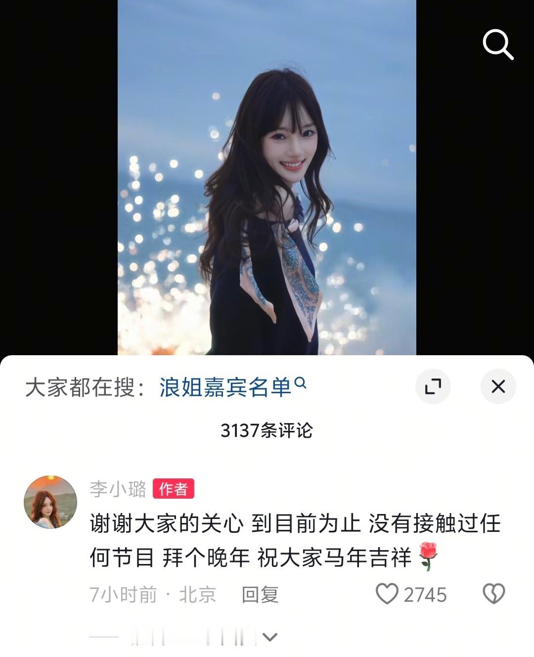 【李小璐说目前没接触过任何节目】李小璐否认将上浪姐 近日,有网友发文称李小璐可能会亮相《乘风》第七季,引发热议。25日,分享视频“长长的人生可以受一点风浪”,并在评论区留言说:“谢谢大家的关心,到目前为止,没有接触过任何节目,拜个晚年,祝大家马年吉祥。”
