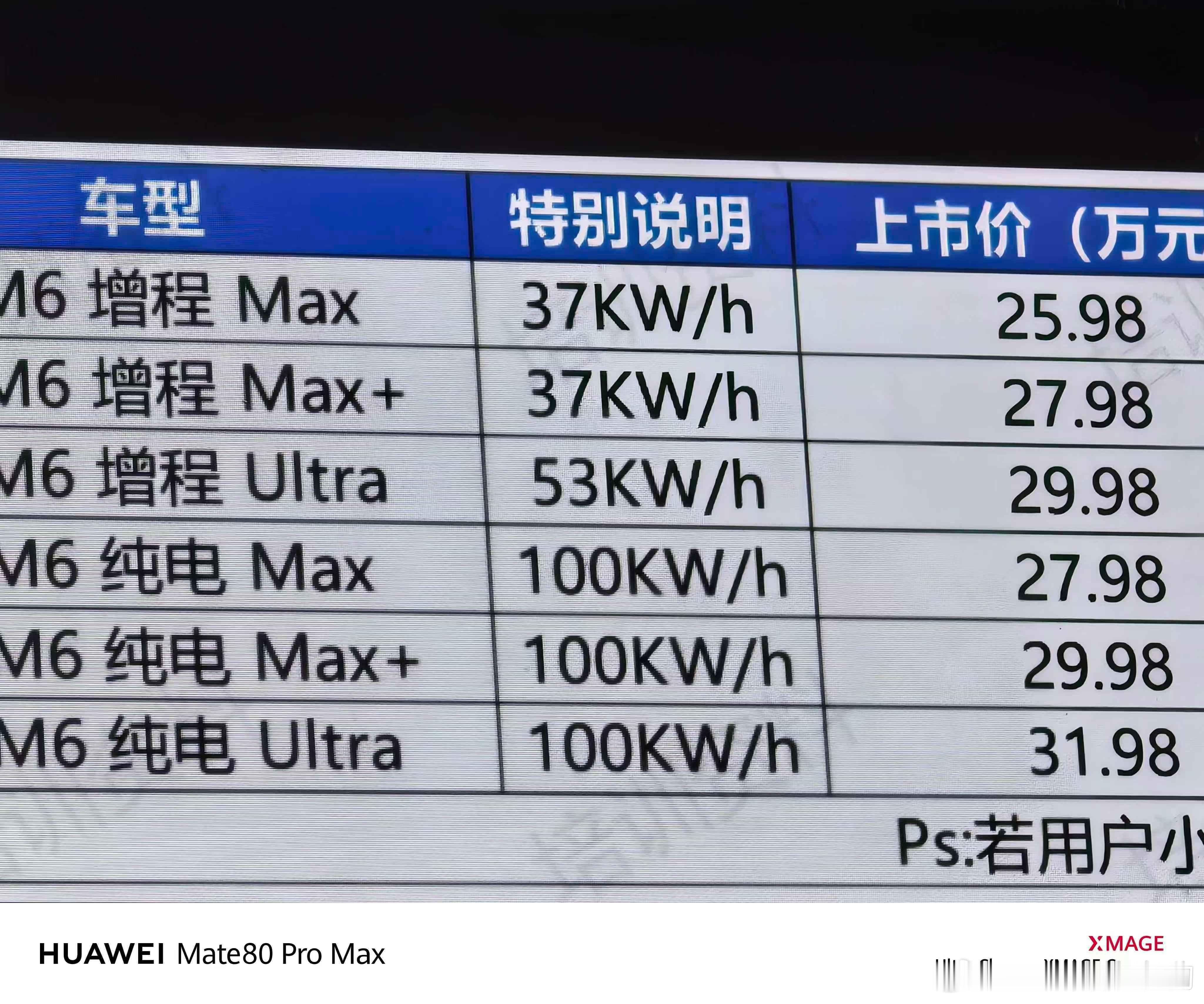某M6的价格这就泄露啦?增程25.98w-29.98w纯电27.98w-31.98w就是增程的电池太小了,中低配才37度,两年前的理想L6还给36.8度呢,高配53度还行
